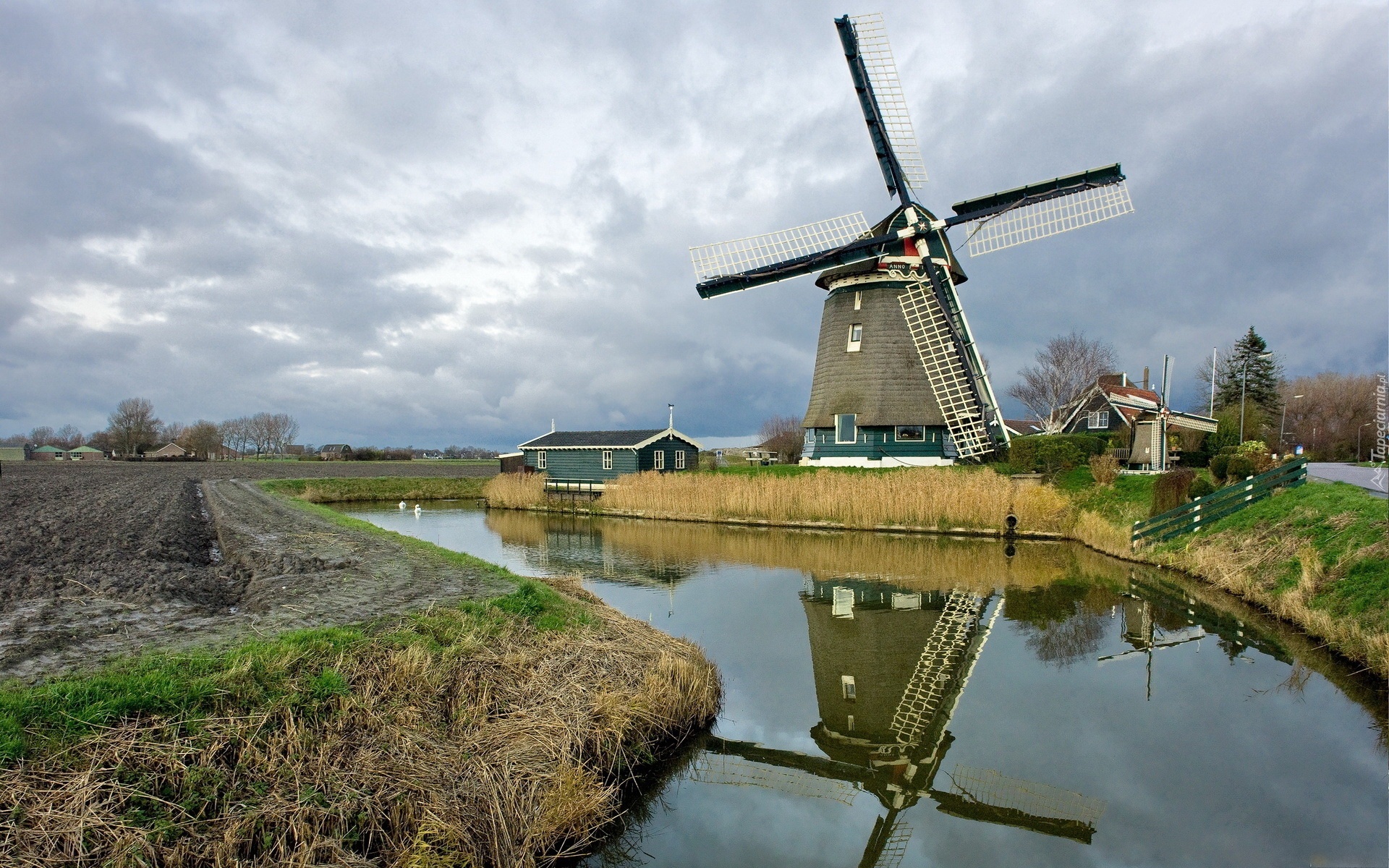 Edytor tapety: Rzeka, Wiatrak, Pole