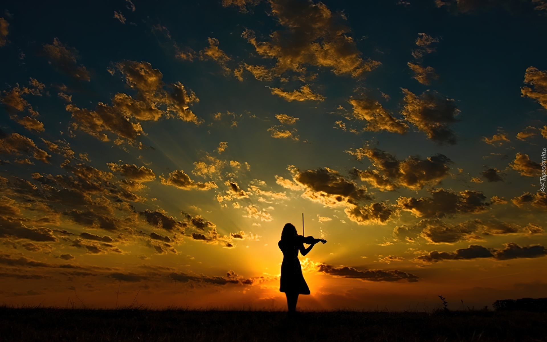 Edytor tapety: Zachód, Słonca, Chmury, Kobieta, Skrzypaczka
