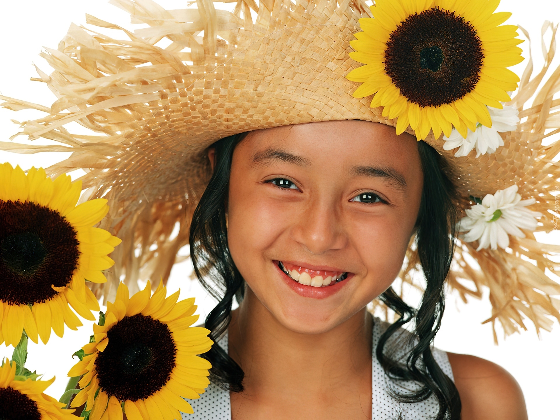 Edytor tapety: Dziewczynka, Uśmiech, Słomiany, Kapelusz, Słoneczniki