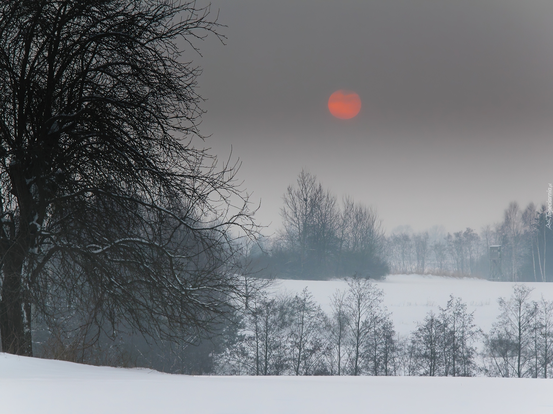 Edytor tapety: Zima, Drzewa, Cerwone, Słońce