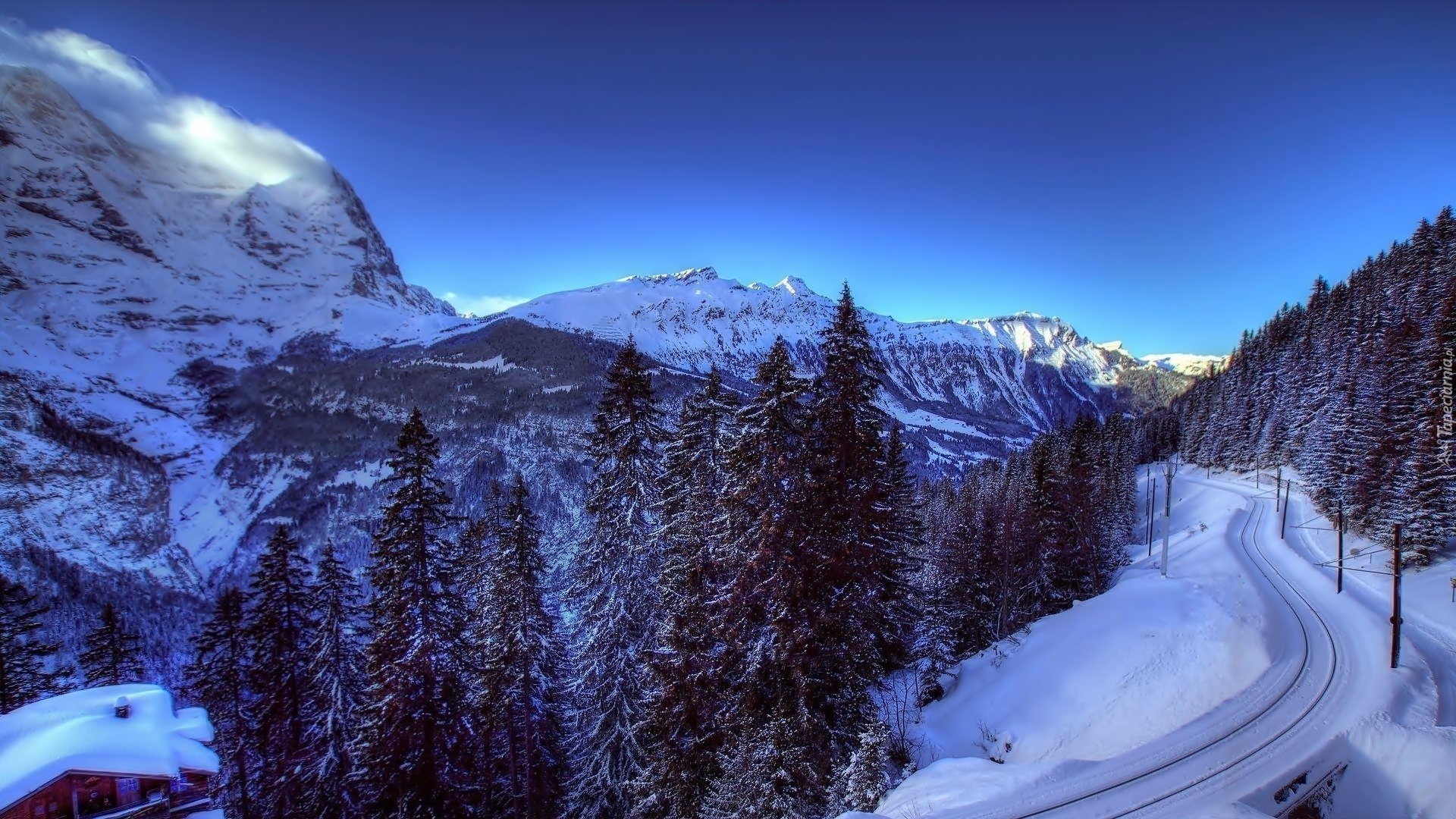 Edytor tapety: Zima, Góry, Droga, Drzewa
