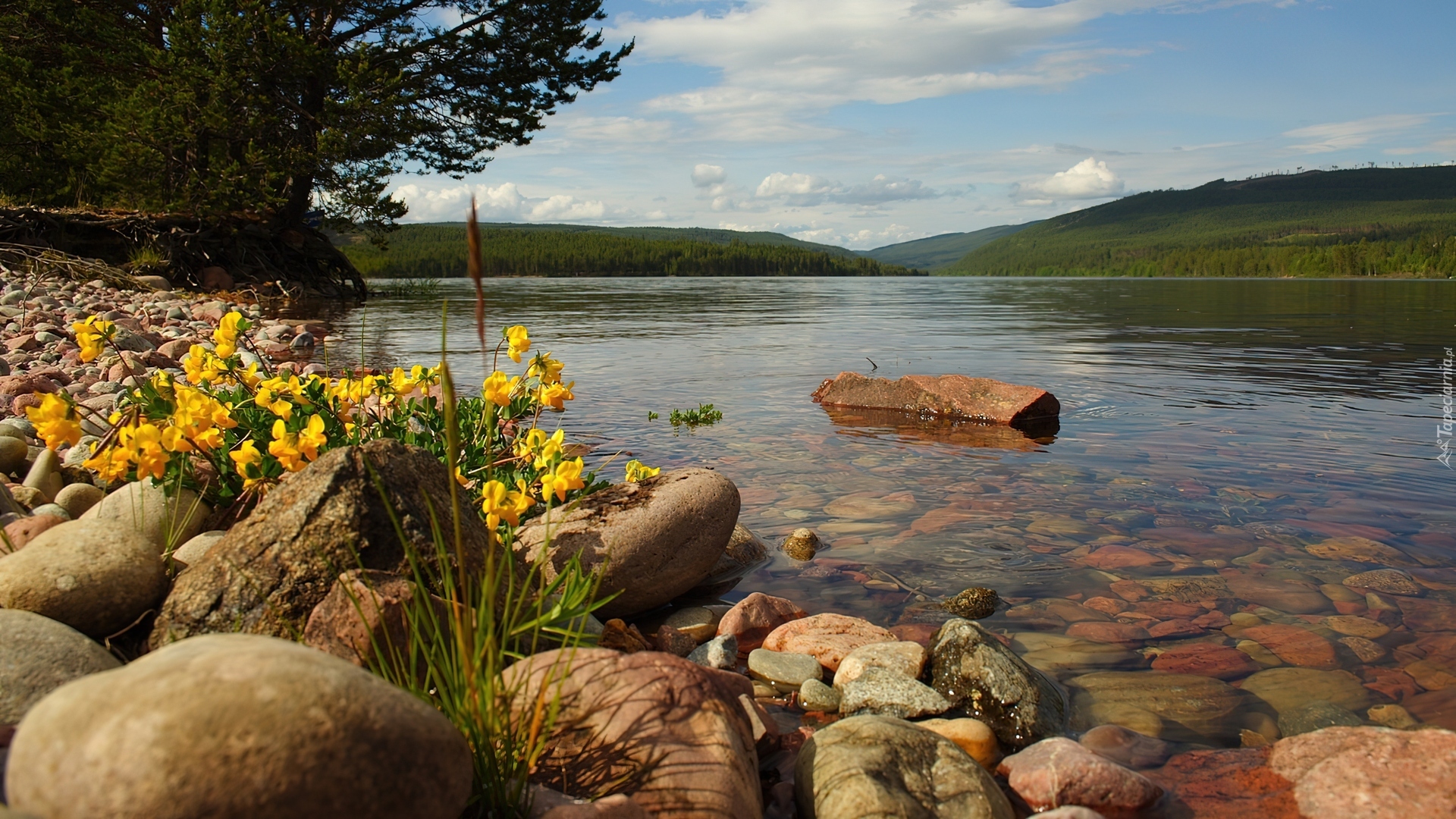 Edytor tapety: Jezioro, Kamienie, Kwiaty