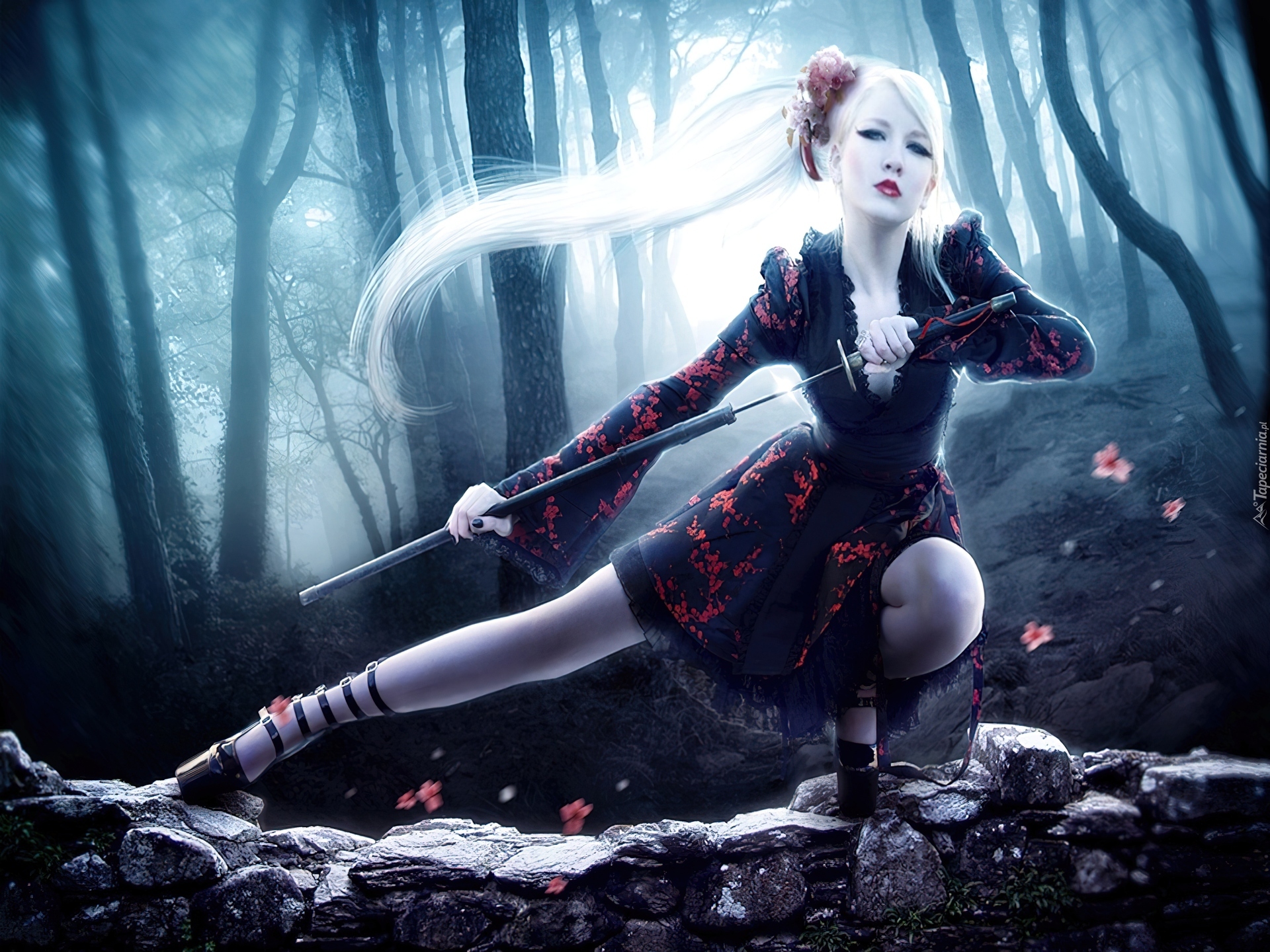 Edytor tapety: Kobieta, Miecz, Las