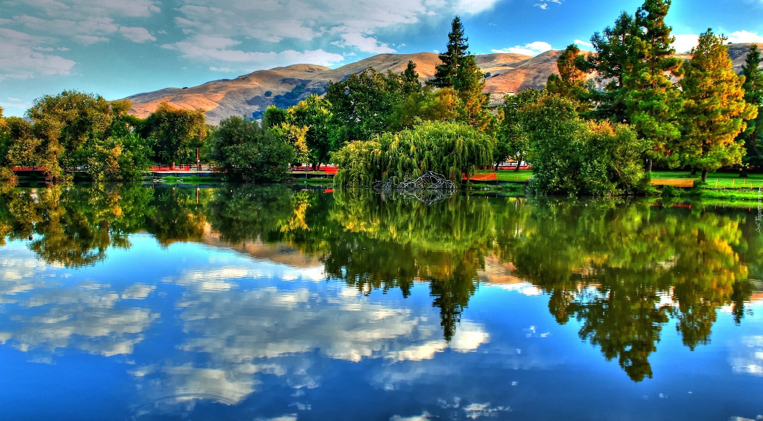 Edytor tapety: Jezioro, Drzewa, Wzgórza