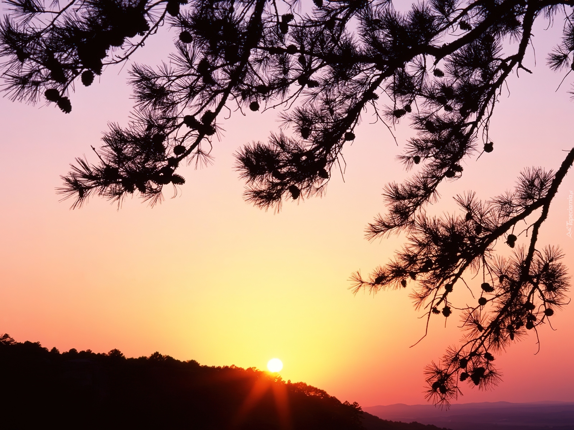Edytor tapety: Zachód, Słońce, Promienie, Gałęzie
