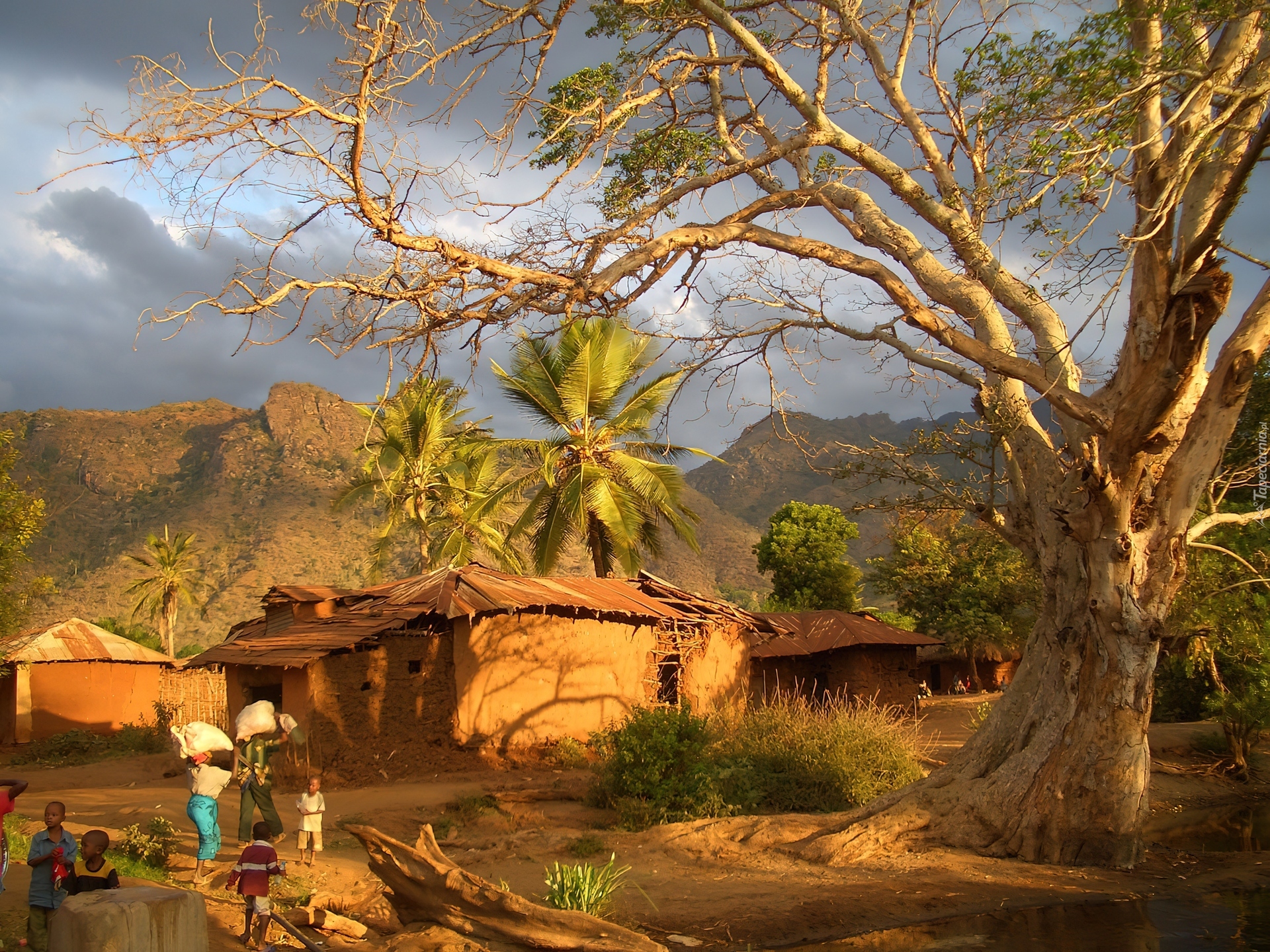 Edytor tapety: Góry, Wioska, Drzewo, Mieszkańcy, Tanzania