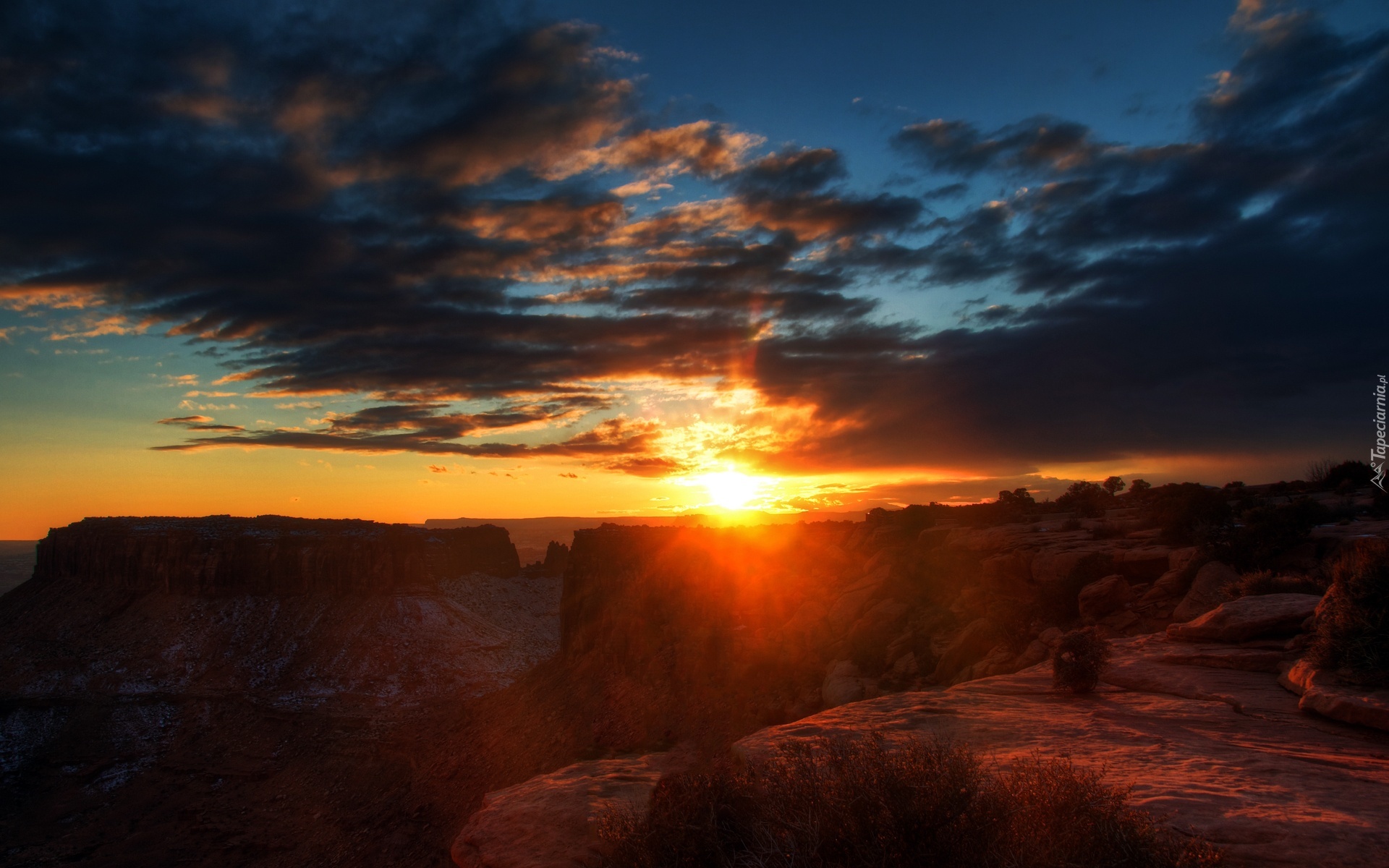 Edytor tapety: Zachód, Słońce, Promienie, Skały