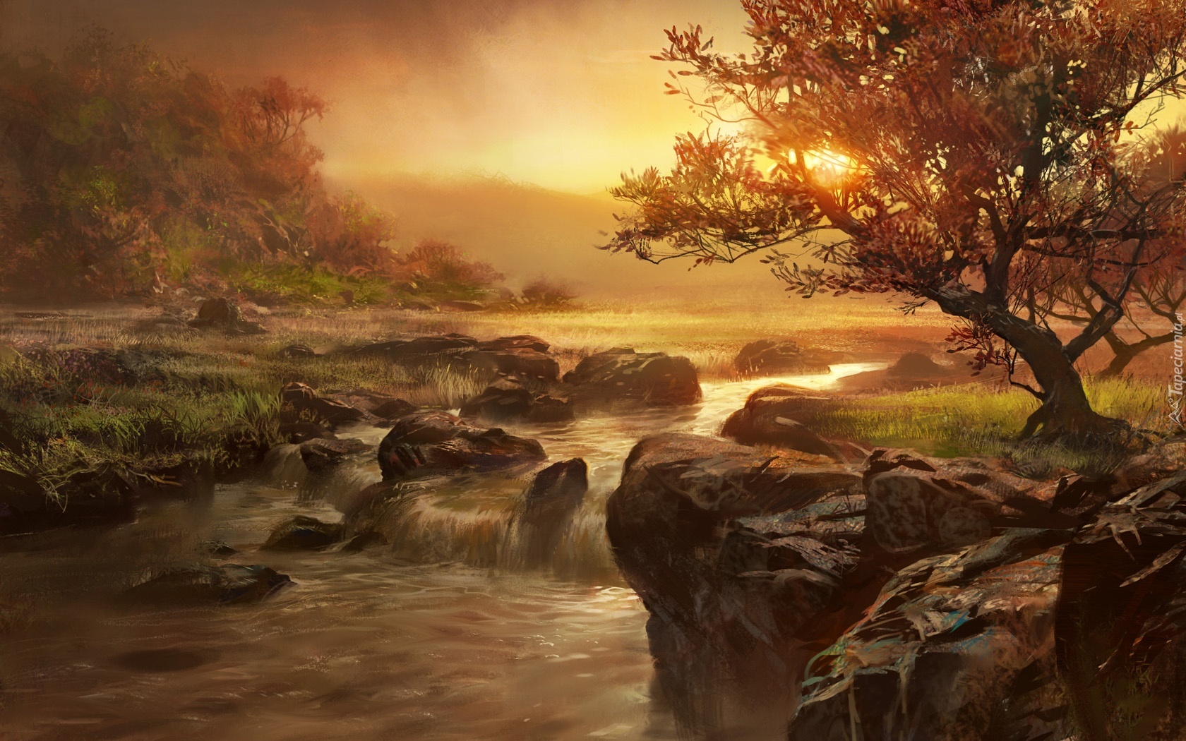 Edytor tapety: Zachód, Słońca, Rzeka, Drzewo, Kamienie