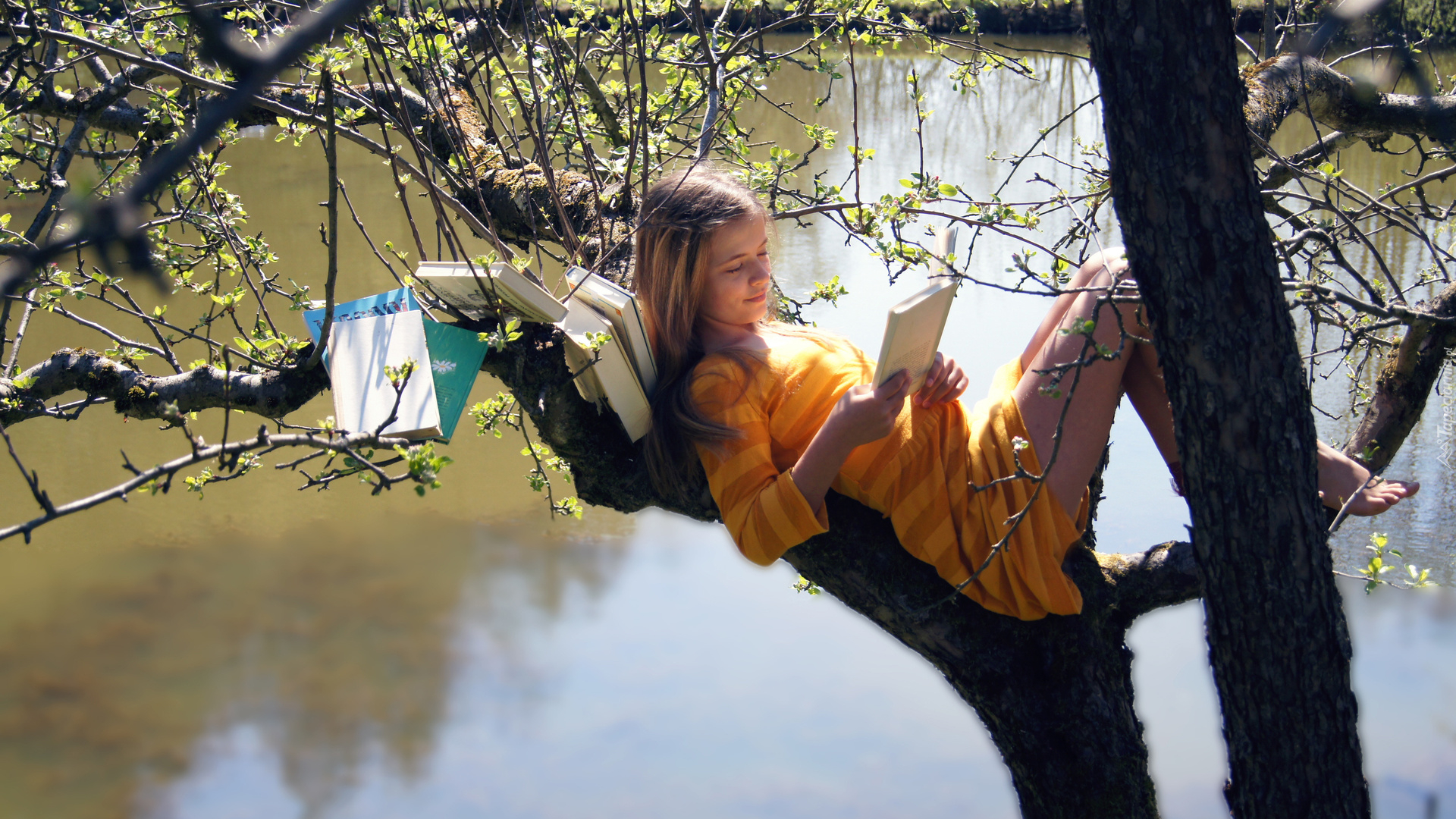 Edytor tapety: Dziewczynka, Drzewo, Książki, Woda