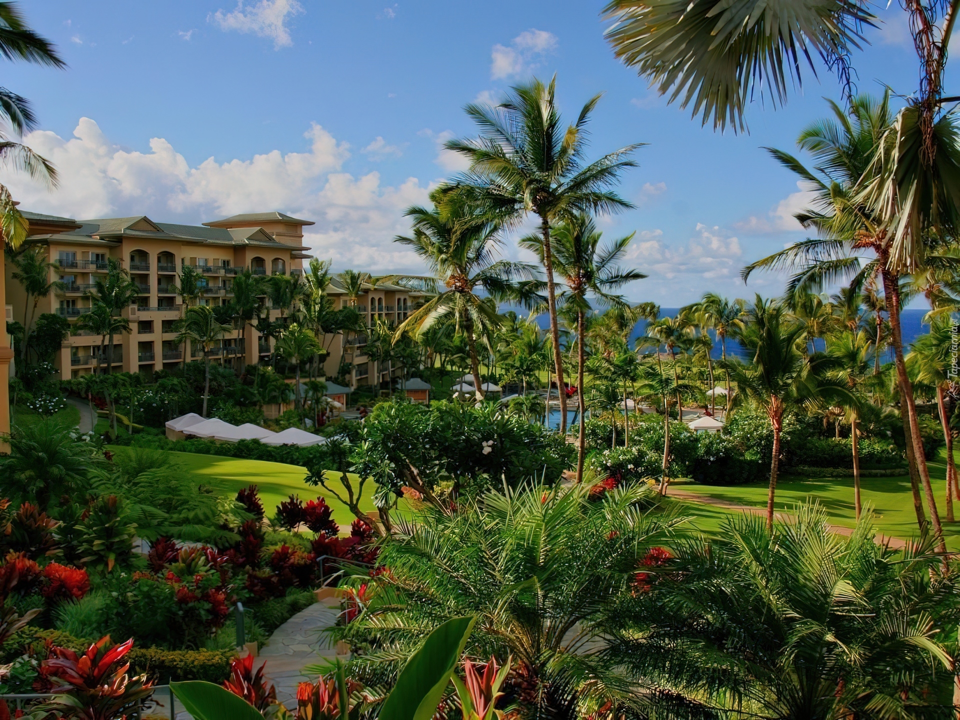 Edytor tapety: Hotel, Park, Kwiaty, Palmy, Morze, Hawaje