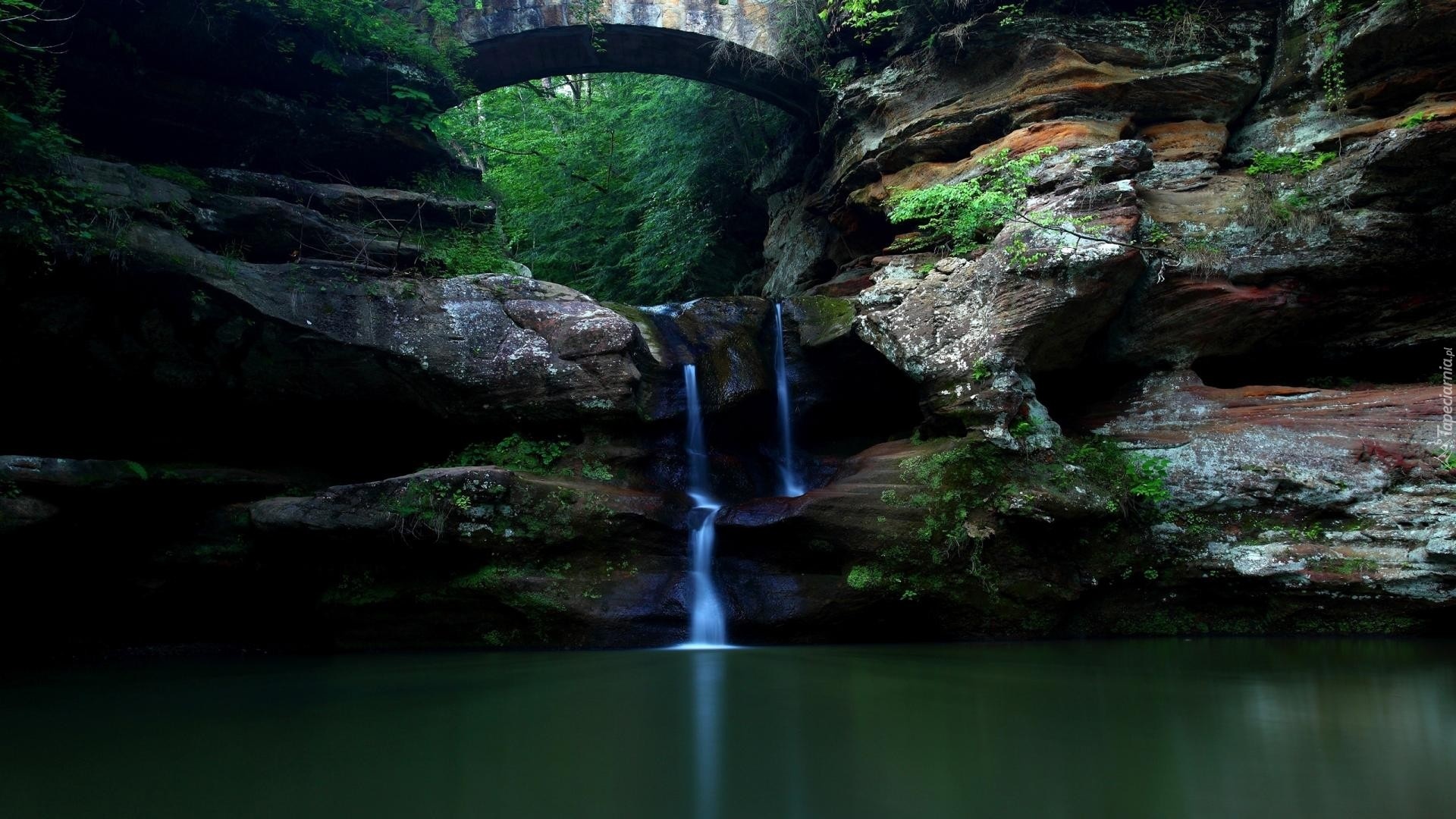 Edytor tapety: Jaskinia, Wodospadzik, Skały, Jezioro