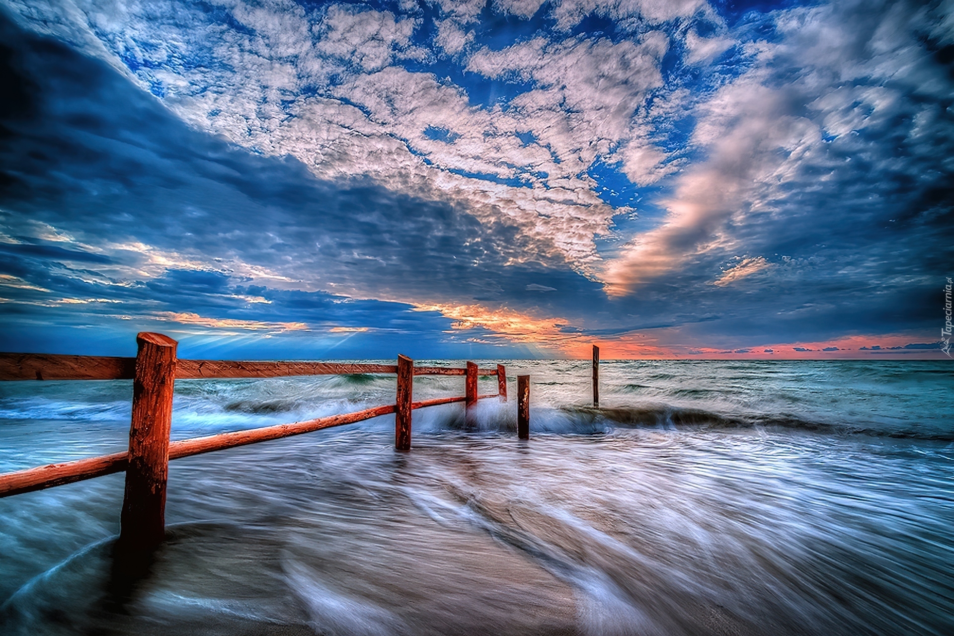 Edytor tapety: Zachód, Słońca, Chmury, Morze, Płotek