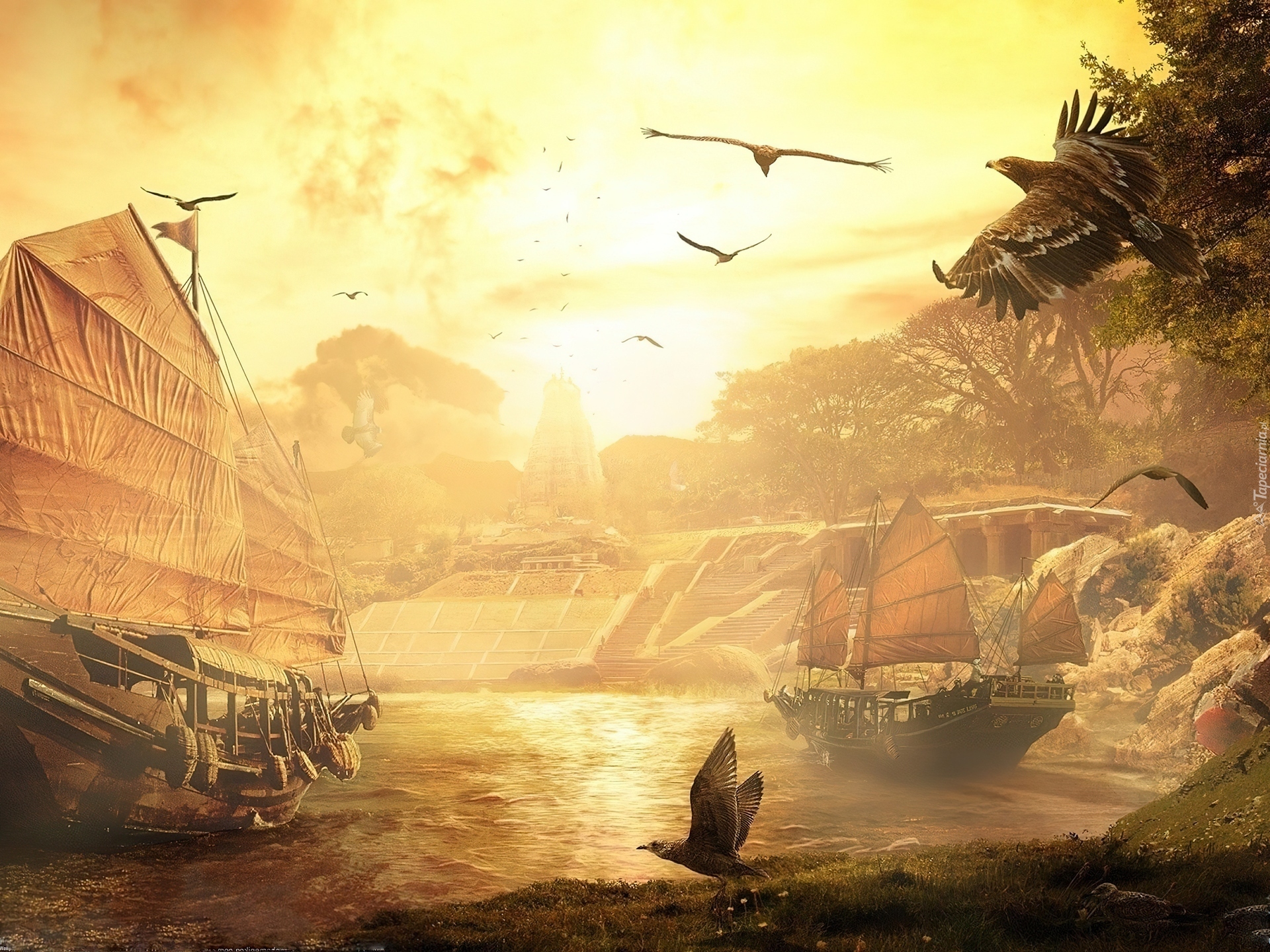 Edytor tapety: Woda, Statki, Ptaki, Słońce