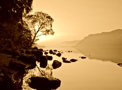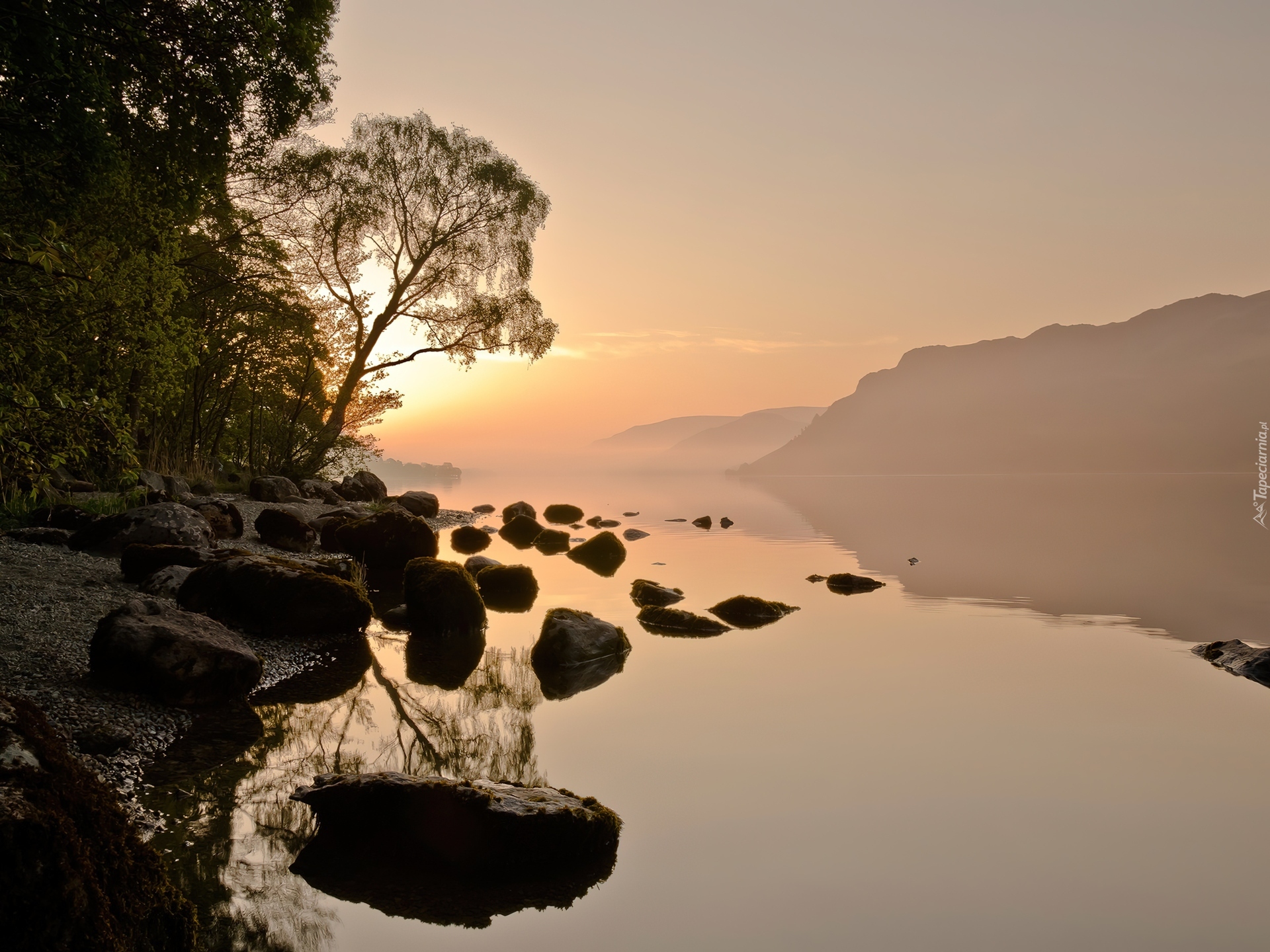 Edytor tapety: Jezioro, Góry, Kamienie, Zachód, Słońca