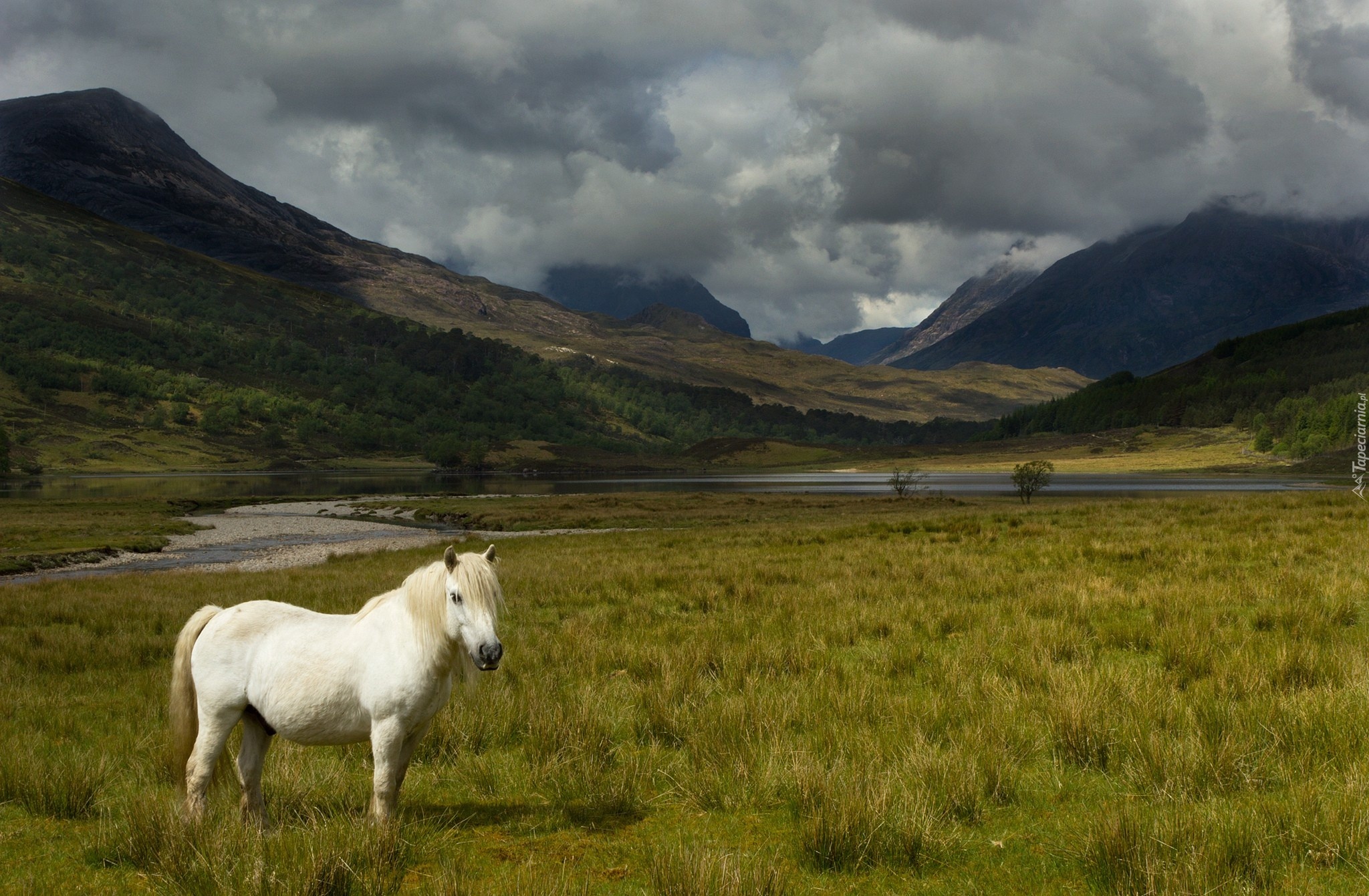 Edytor tapety: Biały, Koń, Trawa, Góry