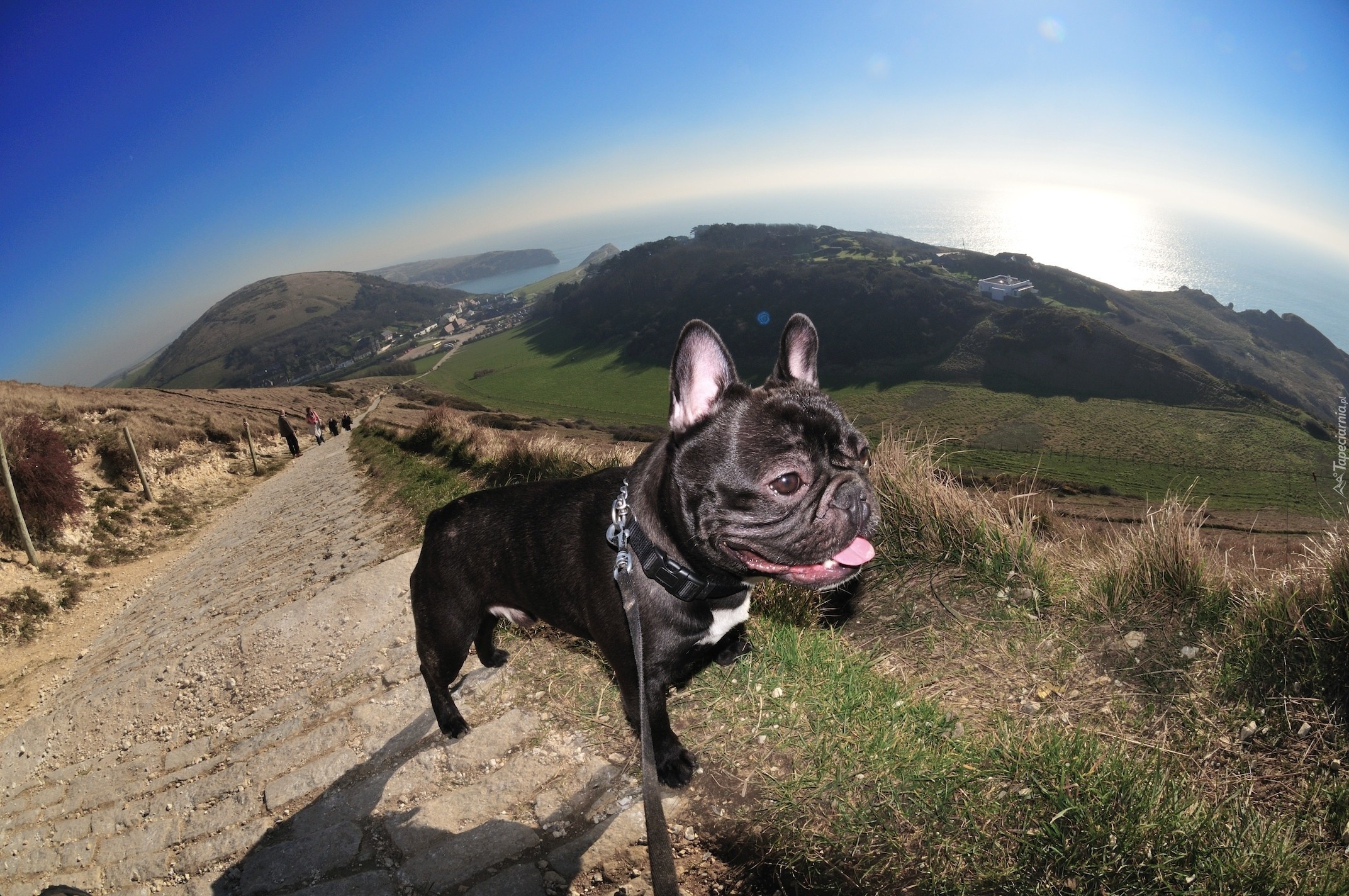Edytor tapety: Buldog Francuski, Droga, Trawa, Niebo