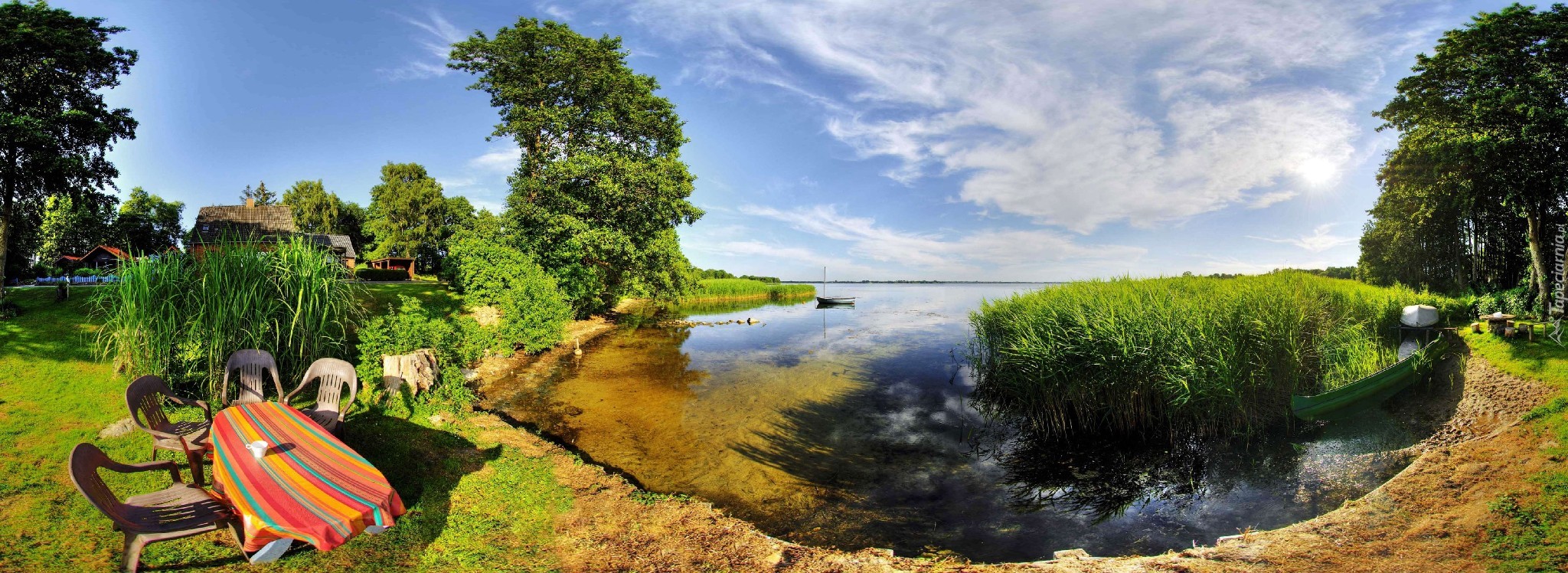 Edytor tapety: Jezioro, Drzewa, Stół, Stołki