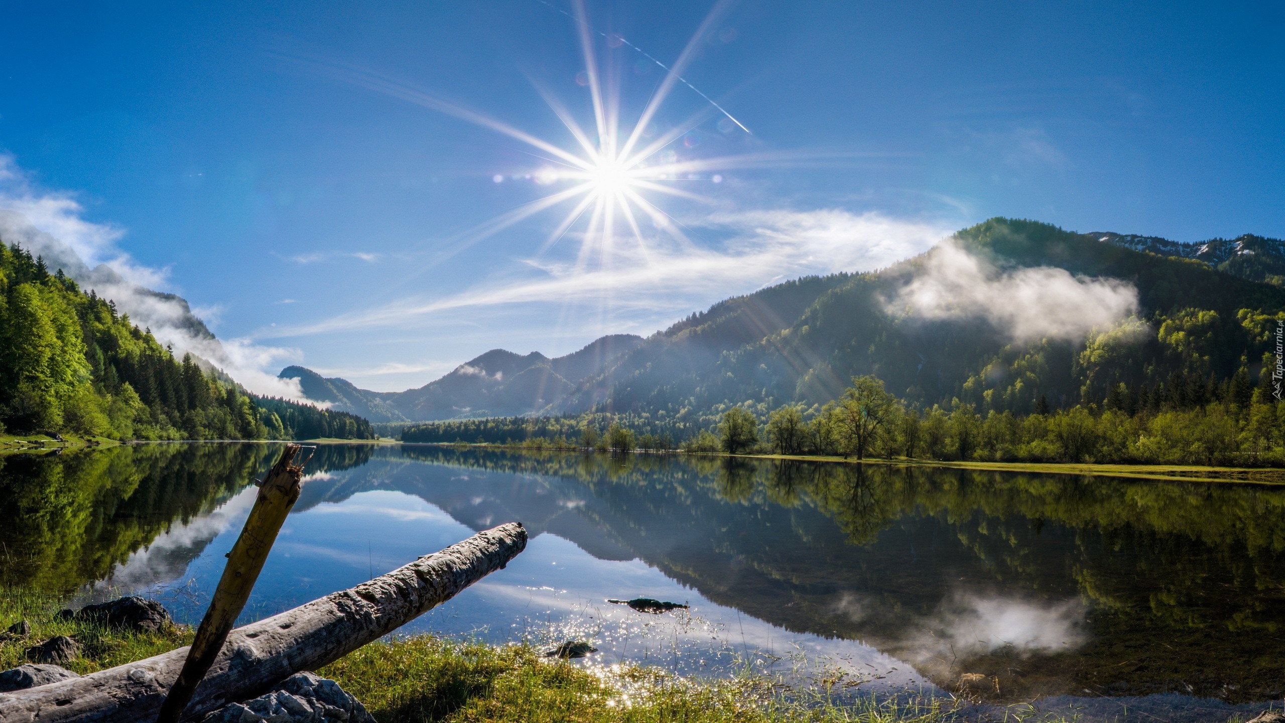 Edytor tapety: Jezioro, Las, Góry, Promienie, Słoneczne