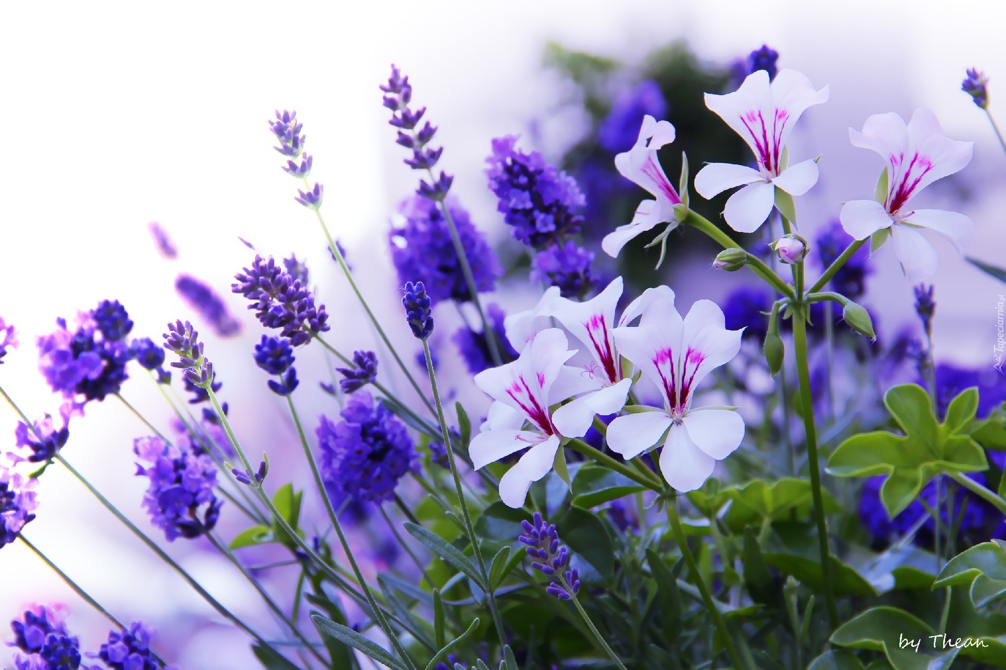Edytor tapety: Białe, Pelargonie, Lawenda, Niebieskie, Kwiaty