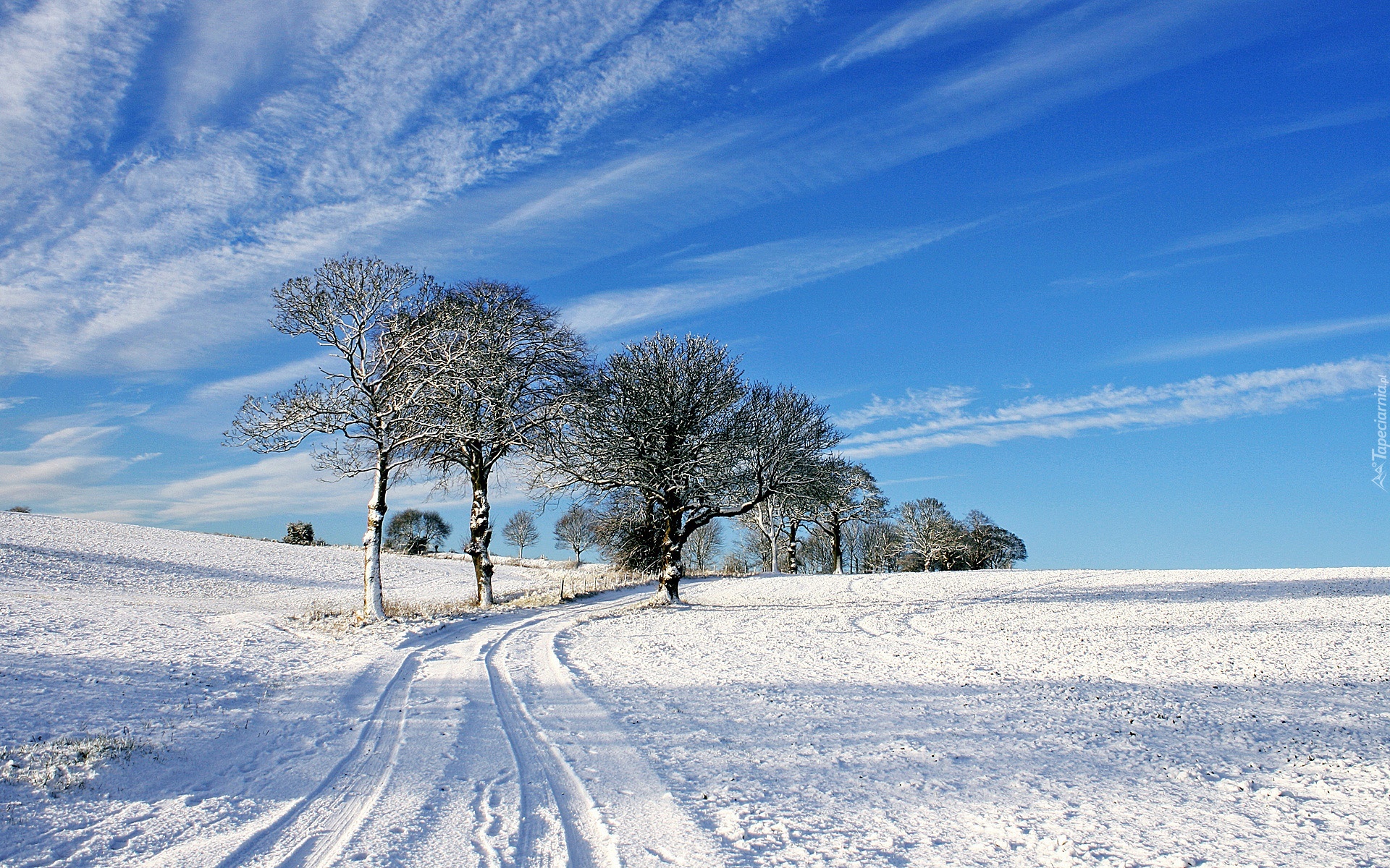 Edytor tapety: Śnieg, Droga, Drzewa, Błękitne, Nieboo
