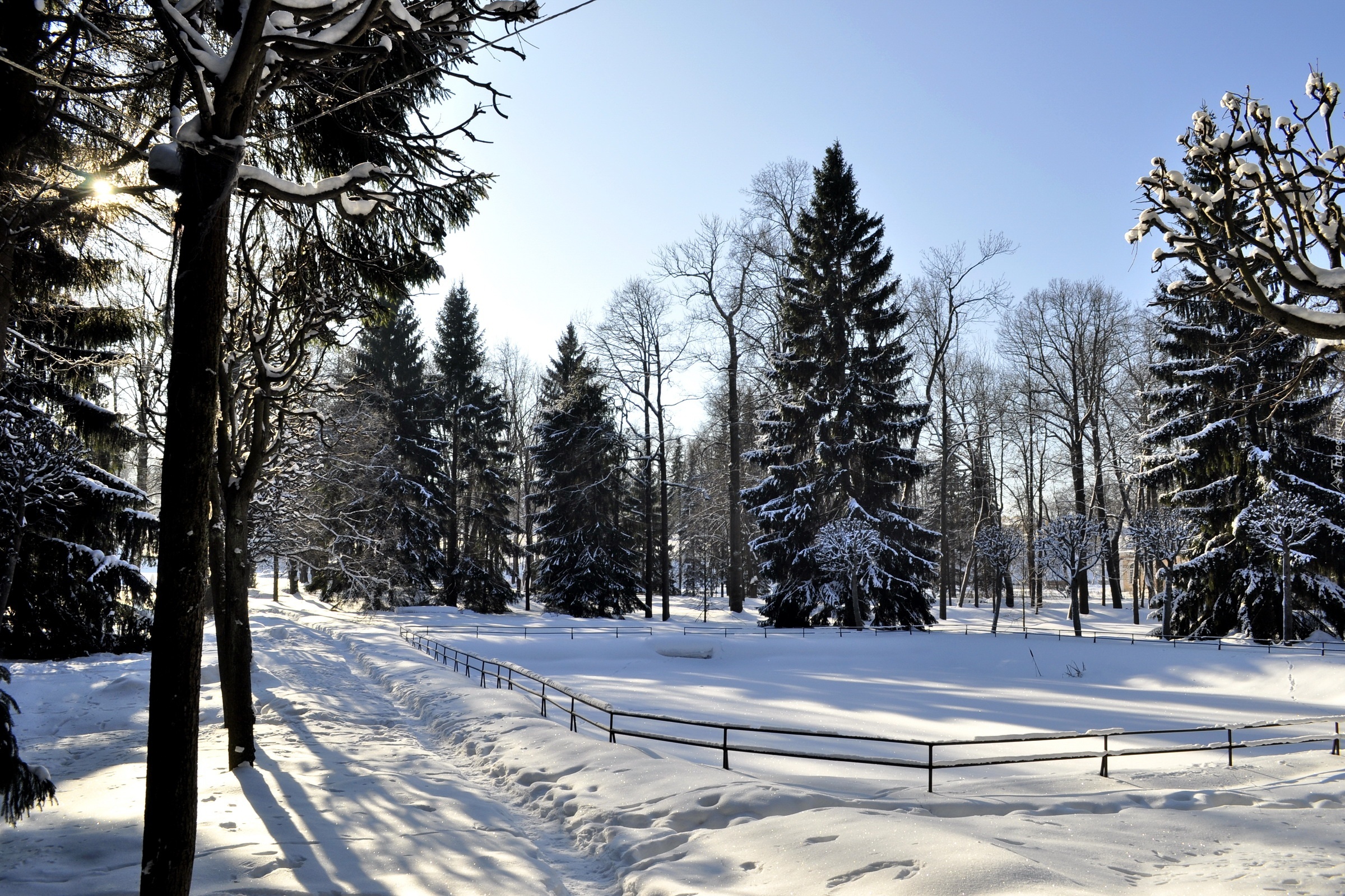 Edytor tapety: Śnieg, Zaspy, Płot, Las, Mróz