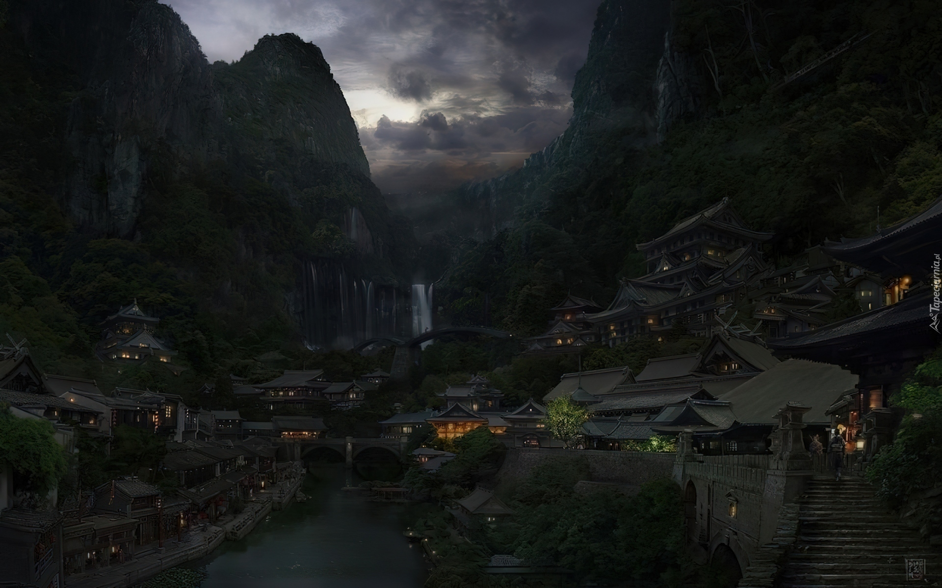 Edytor tapety: Miasto, Chiny, Góry, Wodospad