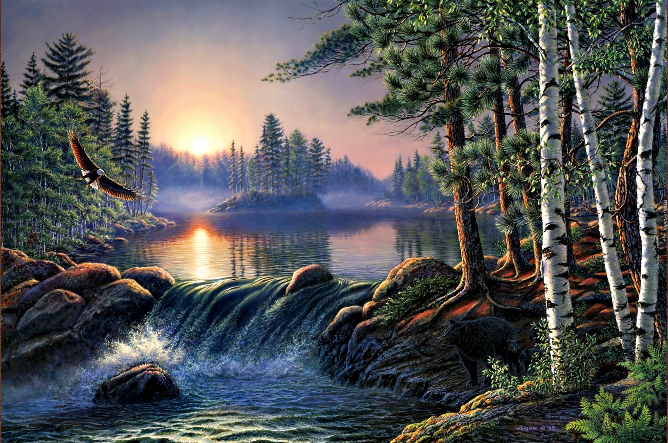 Edytor tapety: Rzeka, Las, Zachód, Słońca, Kamienie, Mały, Wodospad, James Meger