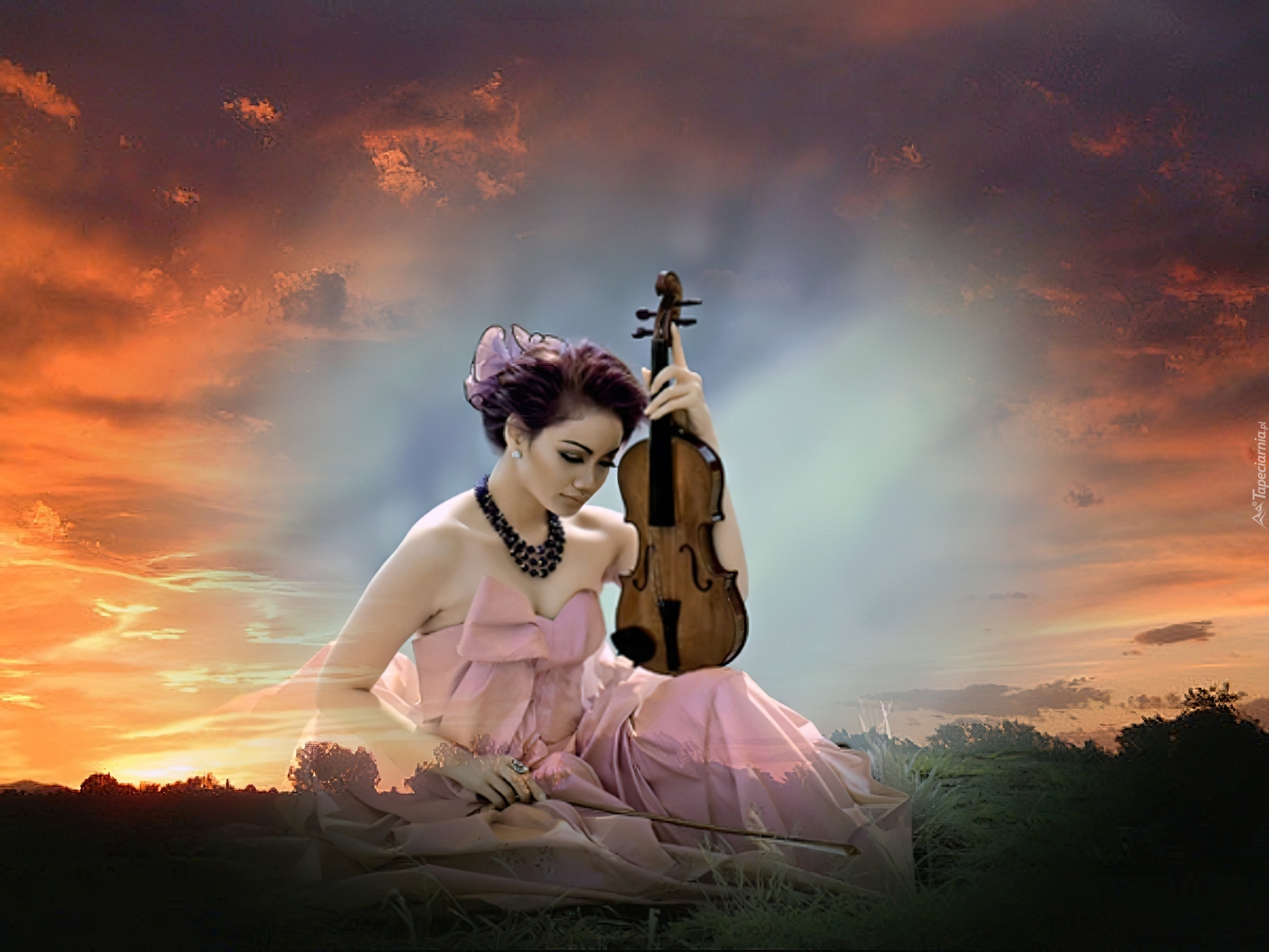 Edytor tapety: Kobieta, Skrzypce, Zachód, Słońca