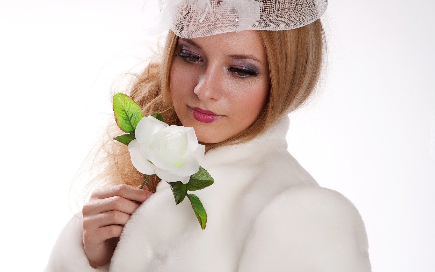 Edytor tapety: Piękna, Kobieta, Kapelusik, Biała, Róża