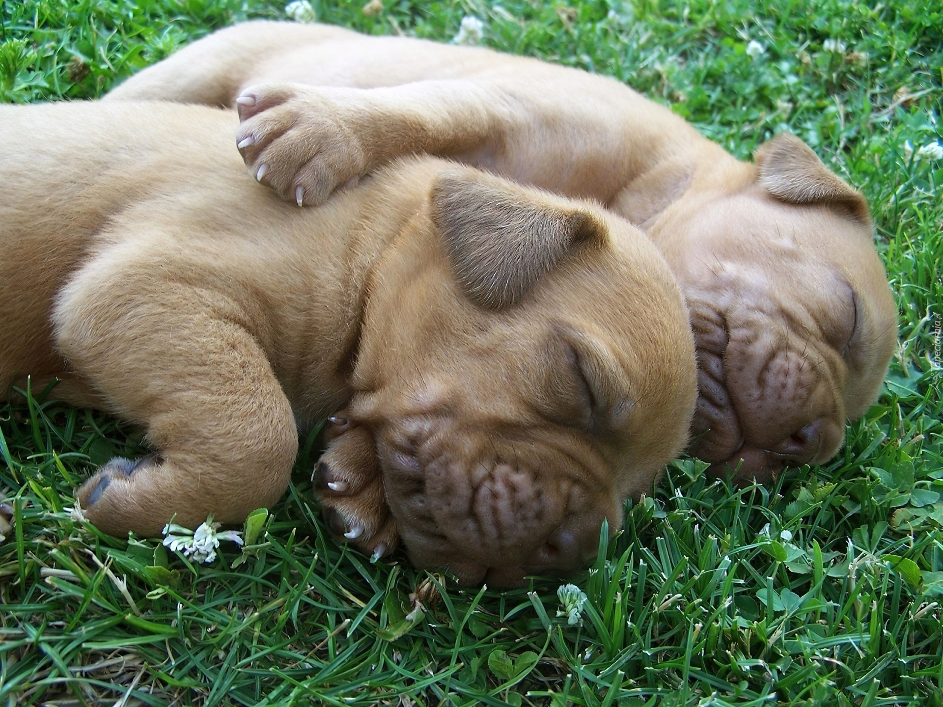 Edytor tapety: Dwa, Szczeniaczki, Trawa, Dog de Bordeaux