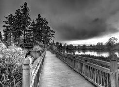 Edytor tapety: Zachód, Słońca, Jezioro, Mostek, Drzewa