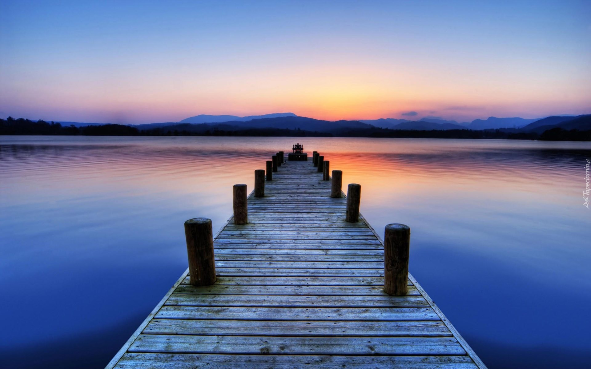 Edytor tapety: Zachód, Niebo, Woda, Pomost, Jezioro, Góry