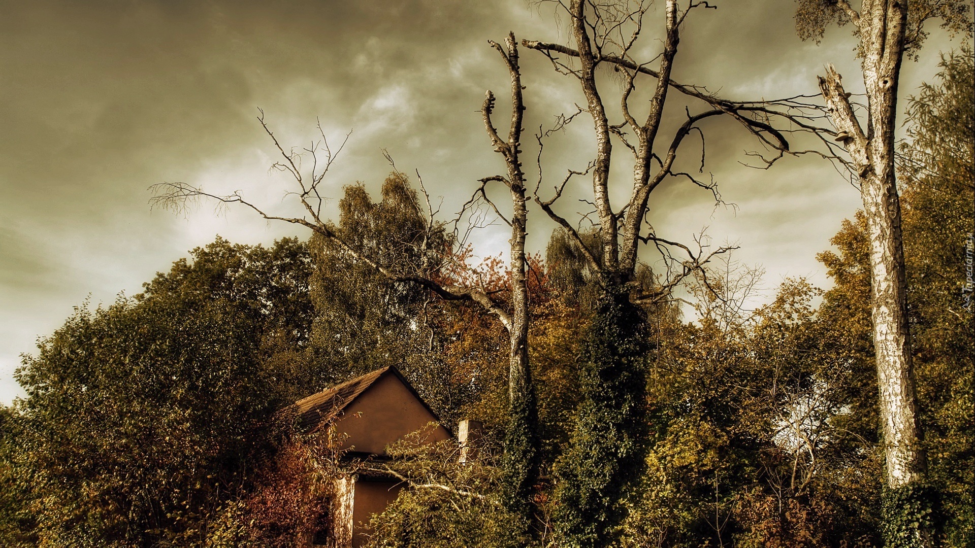 Edytor tapety: Zarośnięty, Dom, Drzewa, Pochmurne, Niebo
