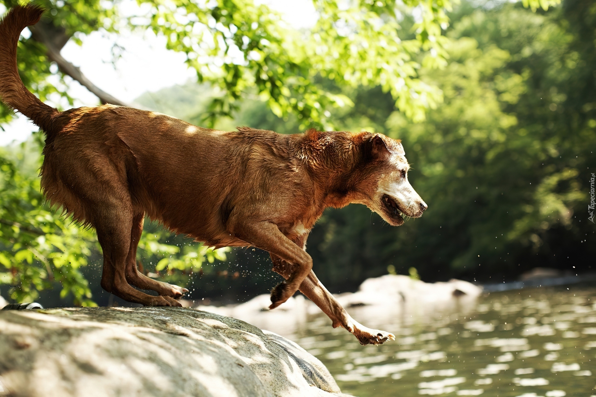 Edytor tapety: Pies, Woda, Skok, Drzewa