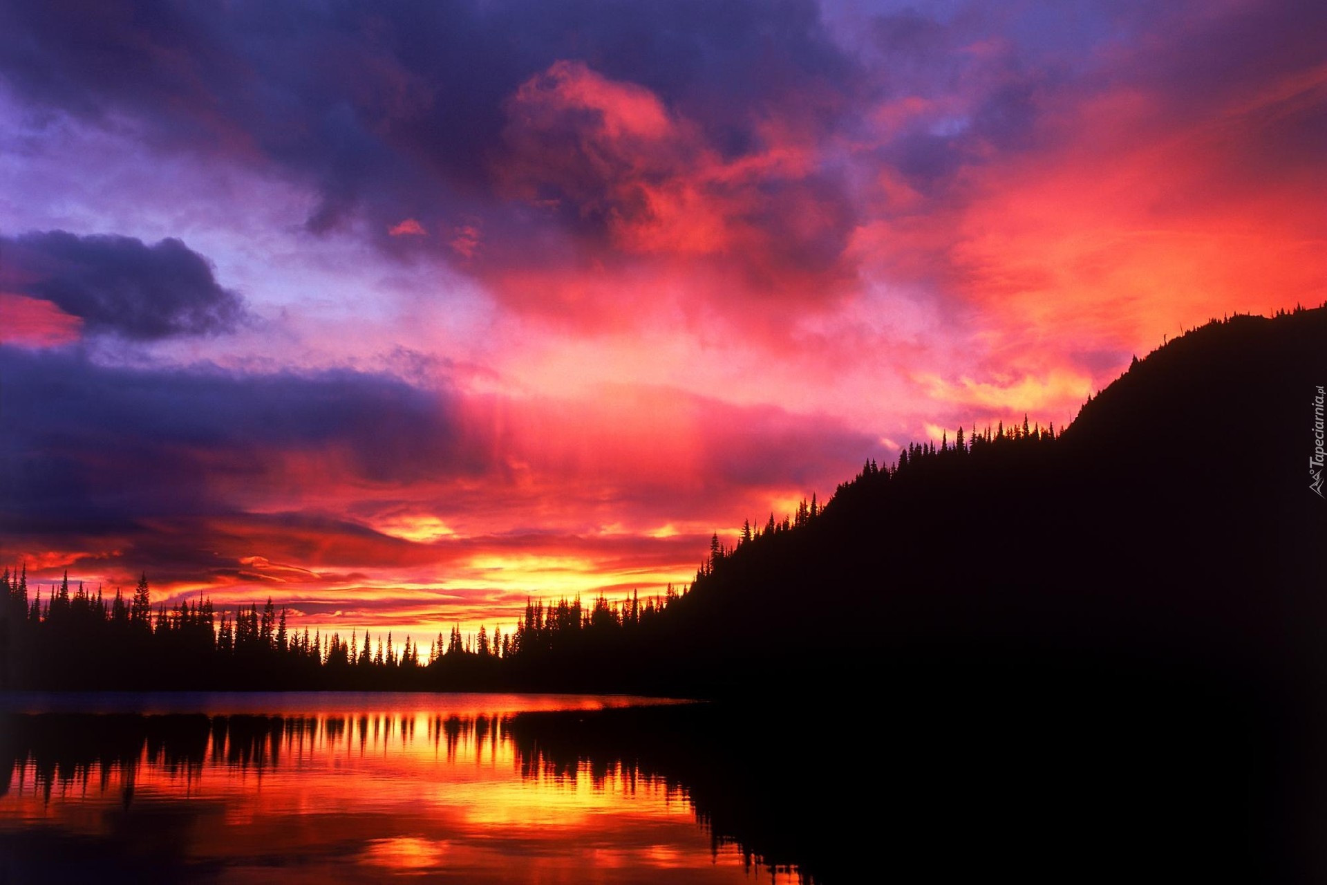 Edytor tapety: Zachód, Słońca, Niebo, Chmury, Woda, Las, Góra