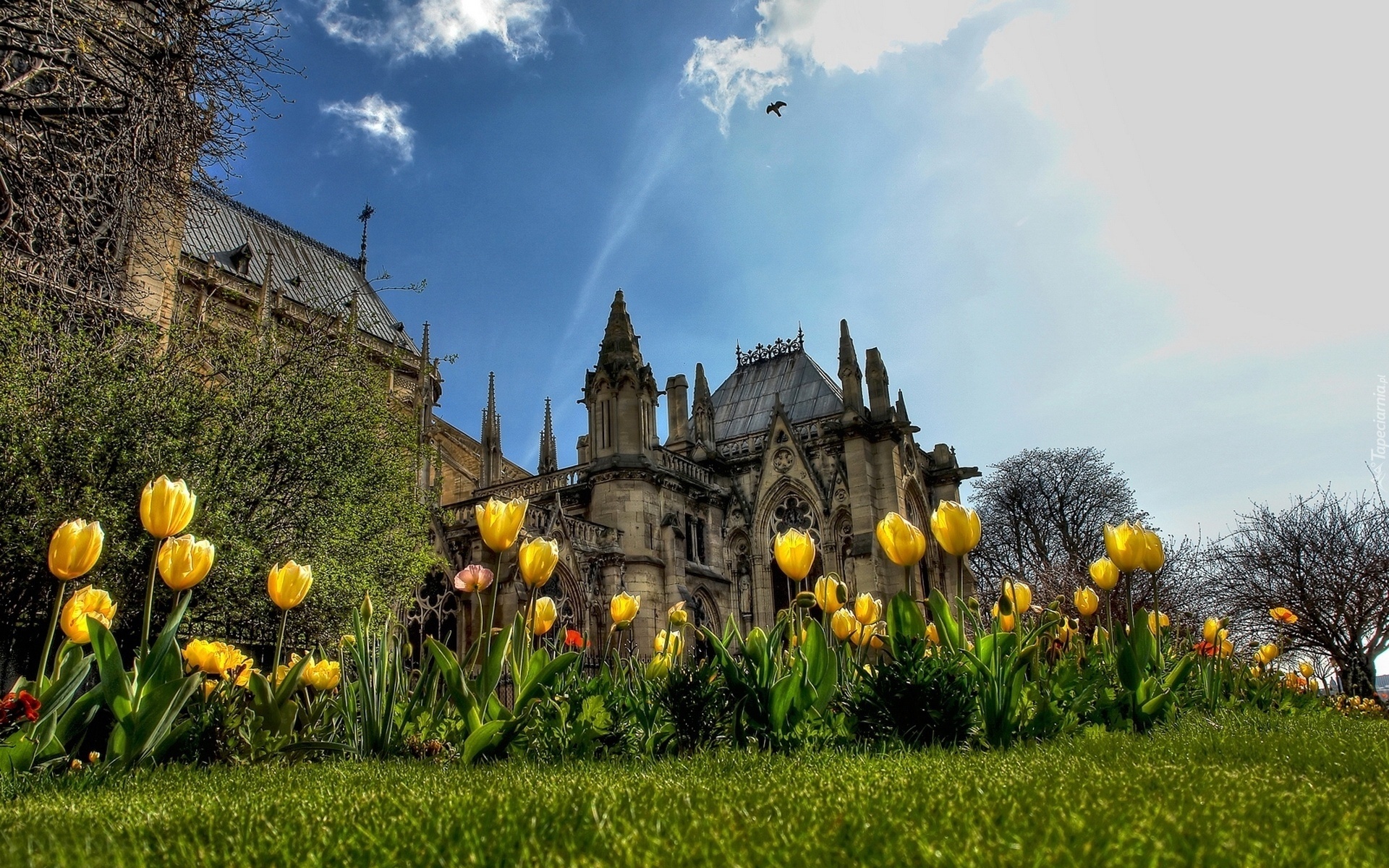 Edytor tapety: Stary, Zamek, Tulipany, Drzewa, Niebo, Ptak