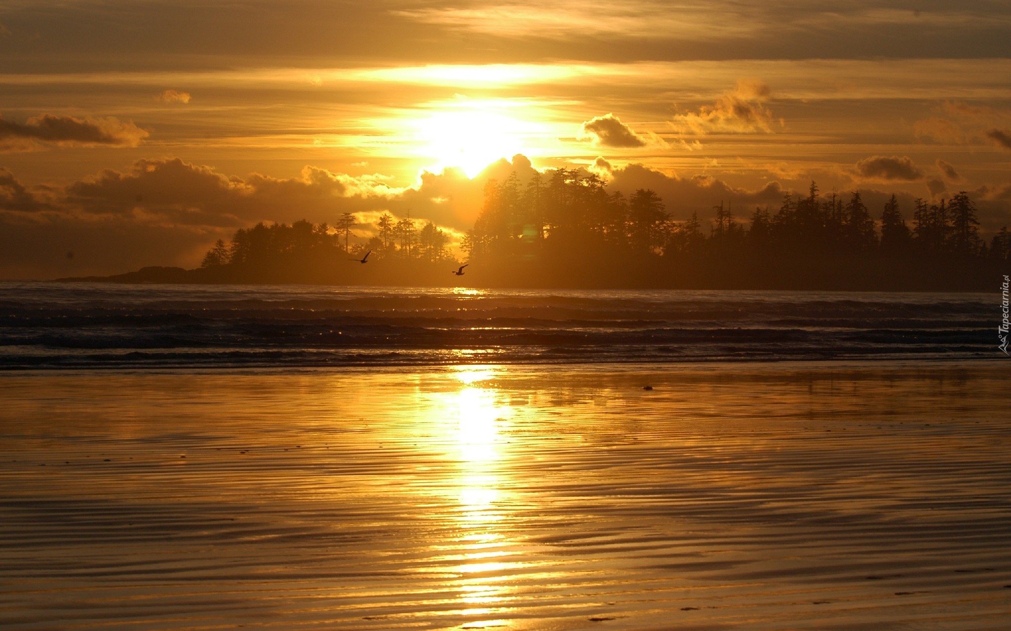 Edytor tapety: Zachód, Słońca, Jezioro, Ptaki