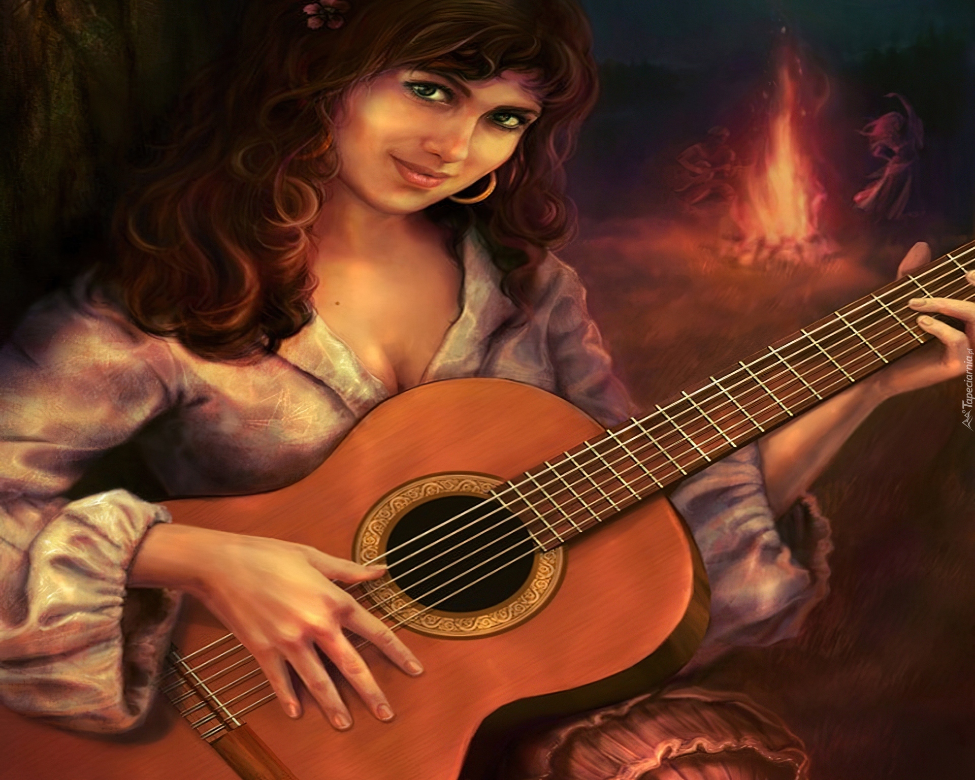 Edytor tapety: Dziewczyna, Gitara, Ognisko