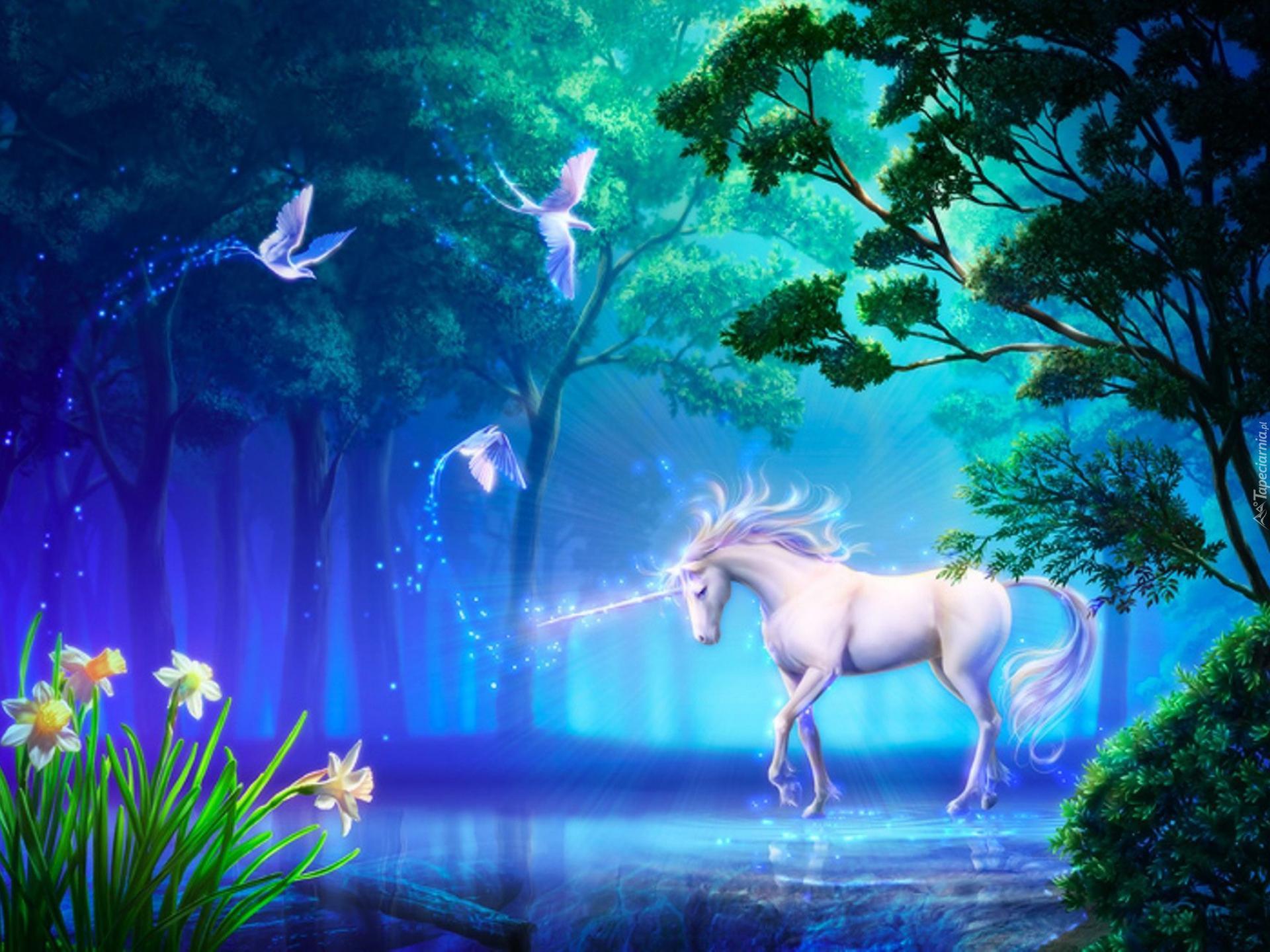 Edytor tapety: Jednorożec, Ptaki, Woda, Drzewa