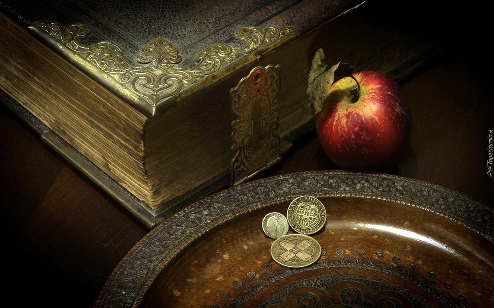 Edytor tapety: Czerwone, Jabłko, Stara, Książka, Monety