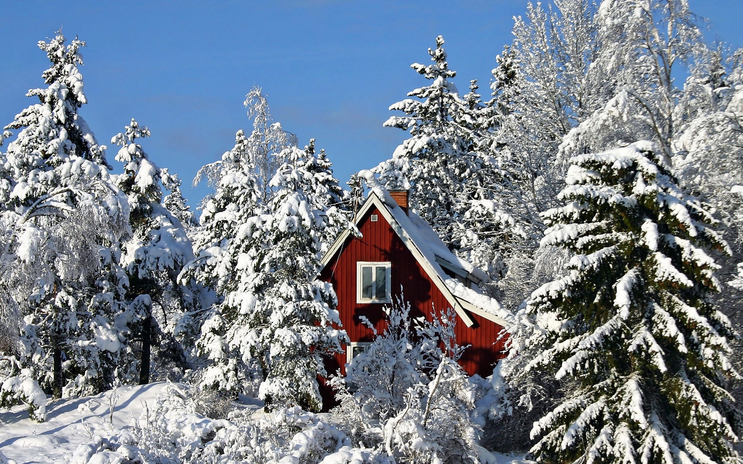 Edytor tapety: Ośnieżone, Świerki, Dom