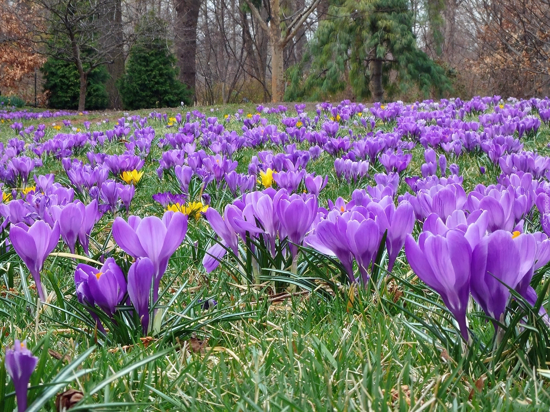 Edytor tapety: Krokusy, Trawa, Drzewa
