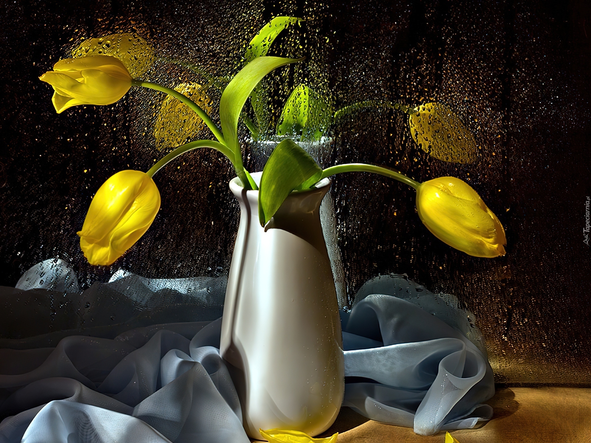 Edytor tapety: Żółte, Tulipany, Krople, Wody