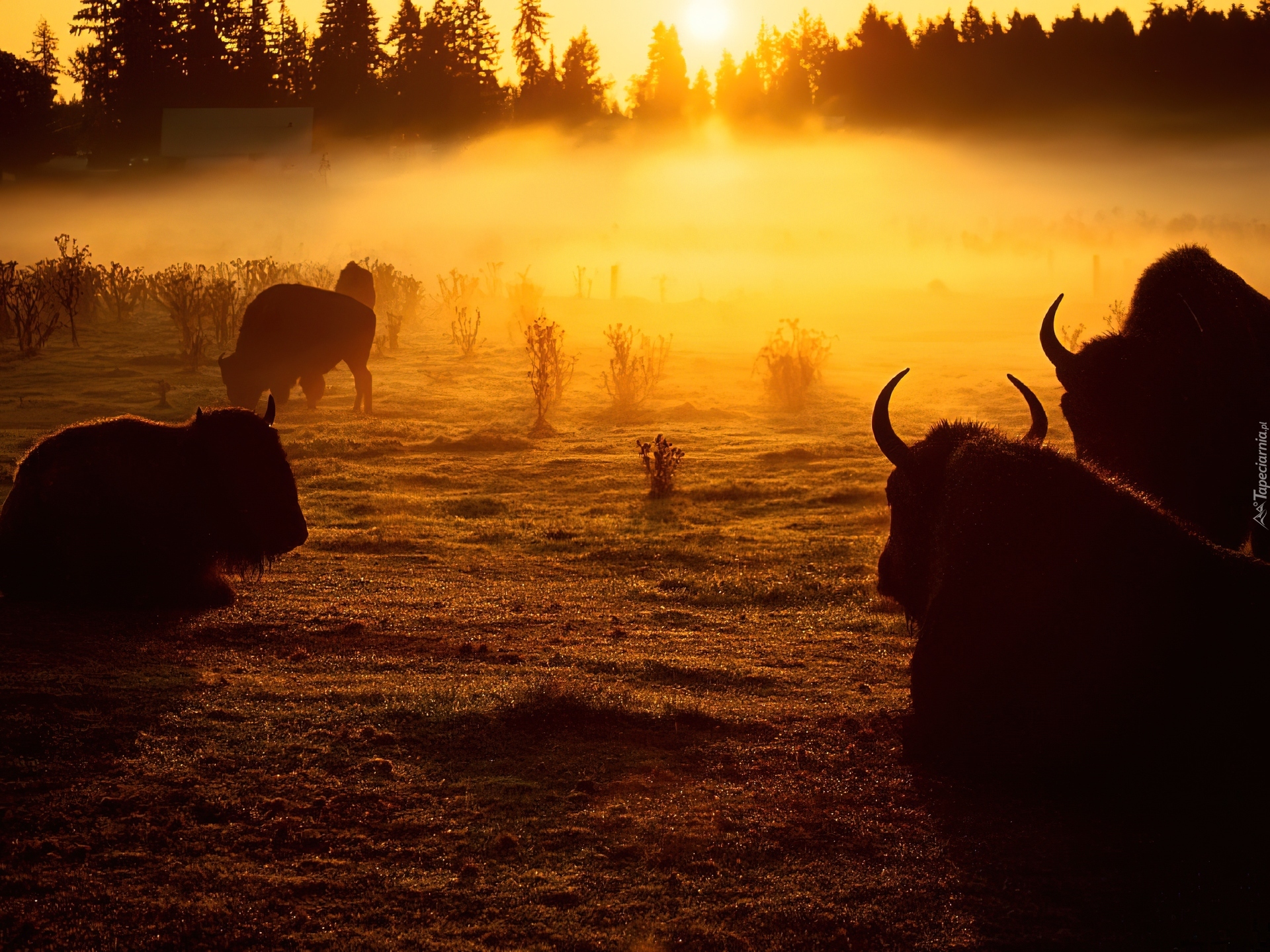 Edytor tapety: Mgła, Wschód, Słońca, Byczki