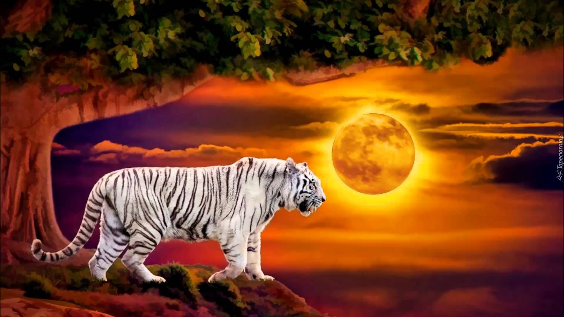 Edytor tapety: Zachód, Słońca, Biały, Tygrys, Drzewo, Art