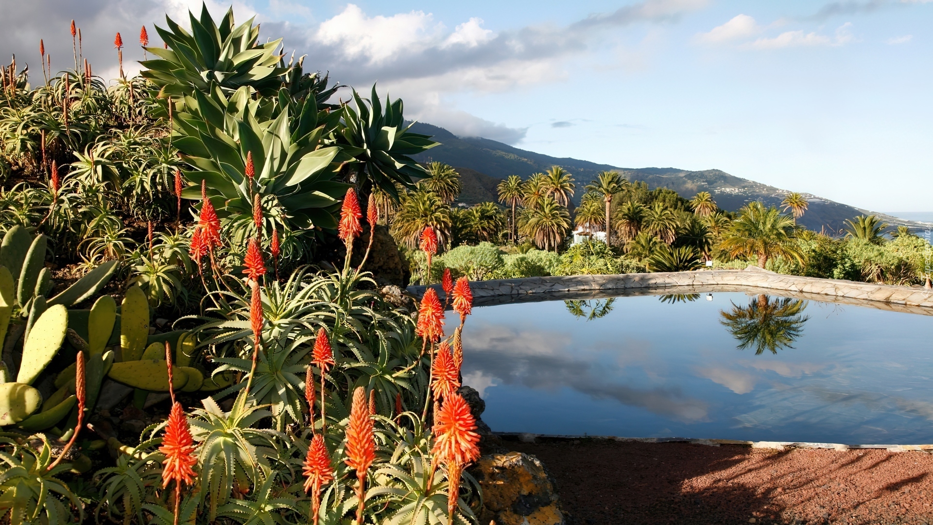 Edytor tapety: Egzotyczne, Kwiaty, Basen, Góry