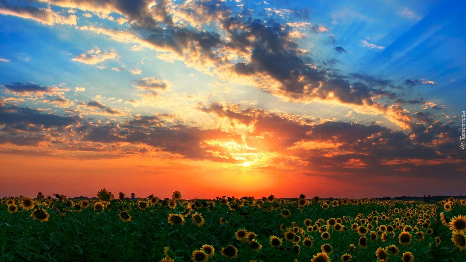 Edytor tapety: Zachód, Słońca, Niebo, Słoneczniki