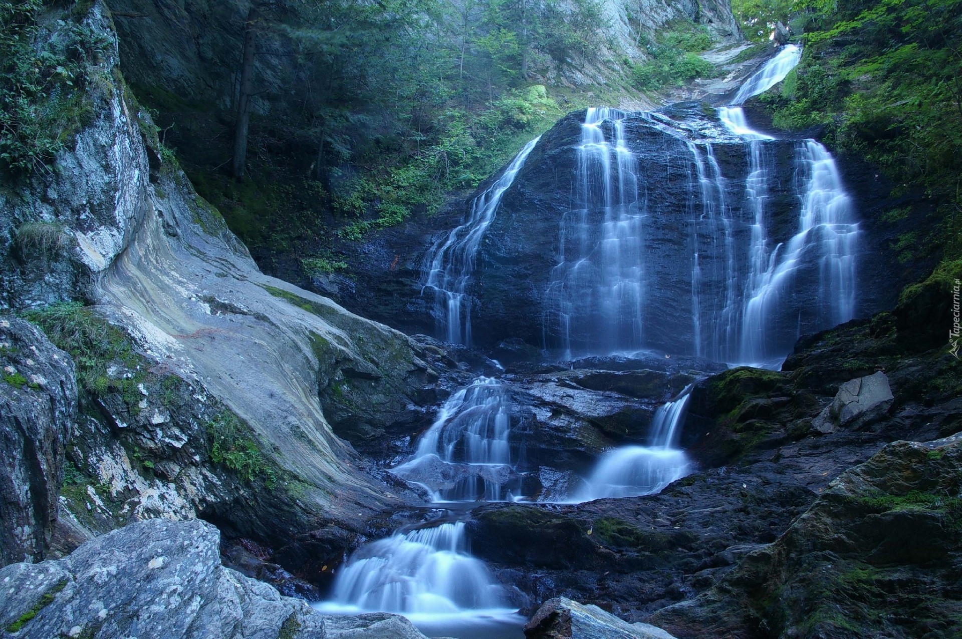 Edytor tapety: Wodospad, Skały, Góra, Mech