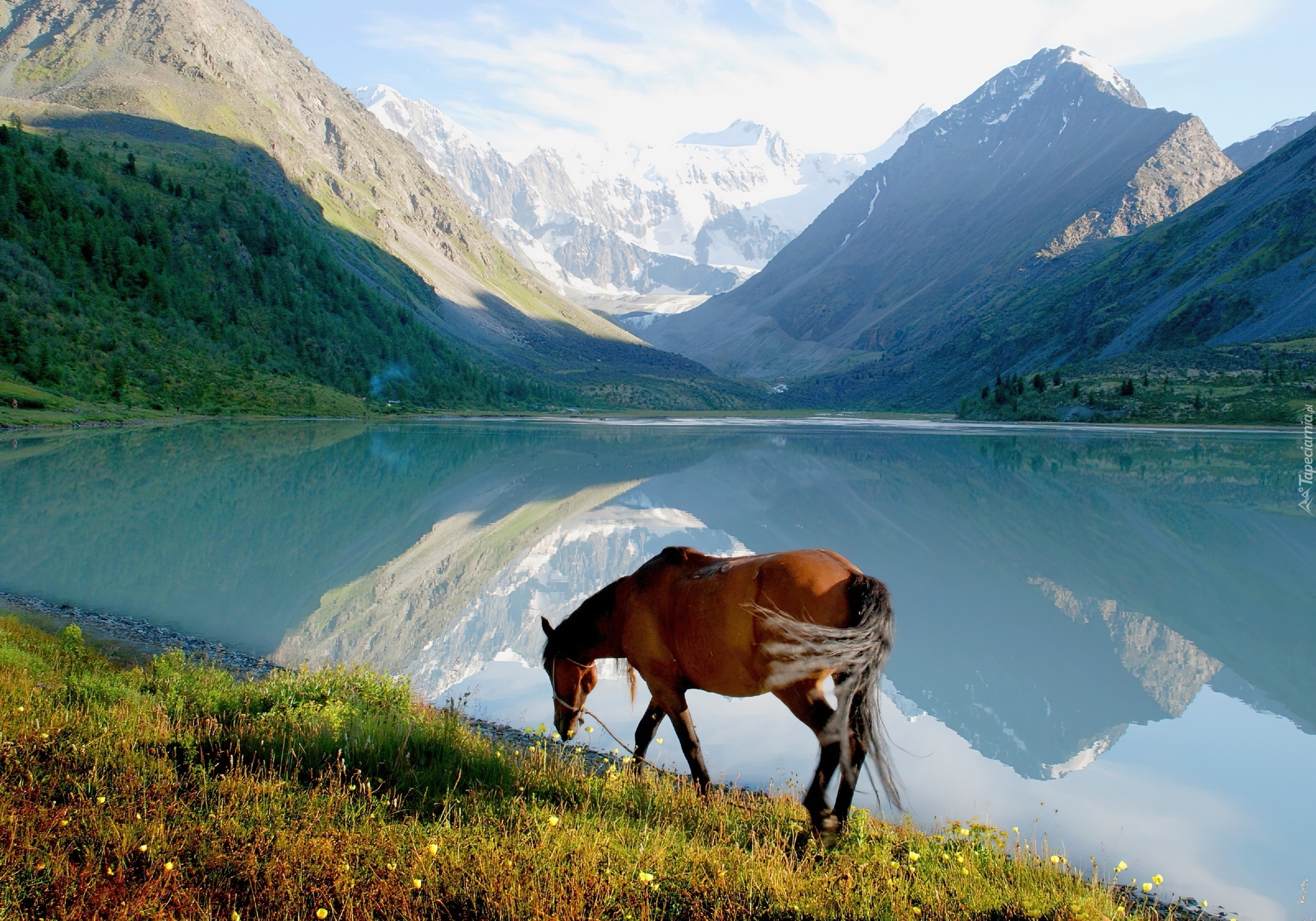 Edytor tapety: Góry, Jezioro, Koń, Trawa