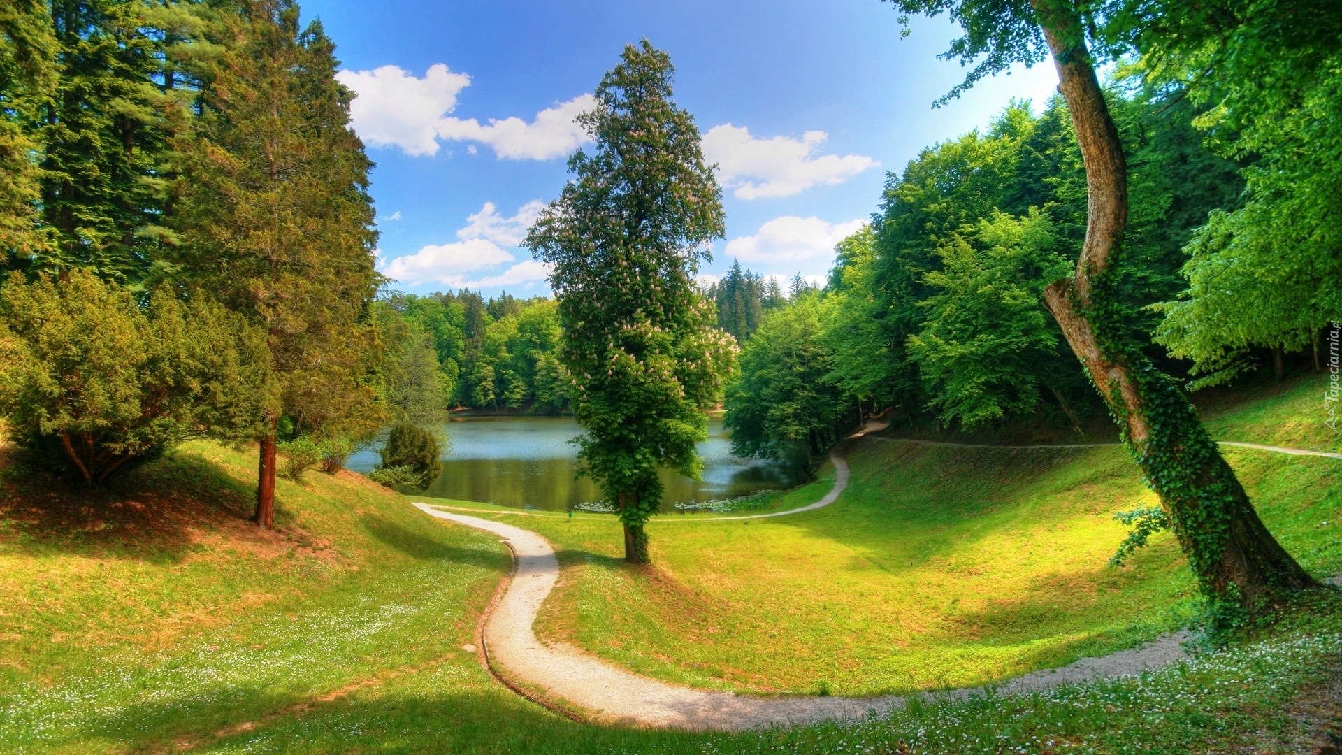 Edytor tapety: Droga, Drzewa, Kwiaty